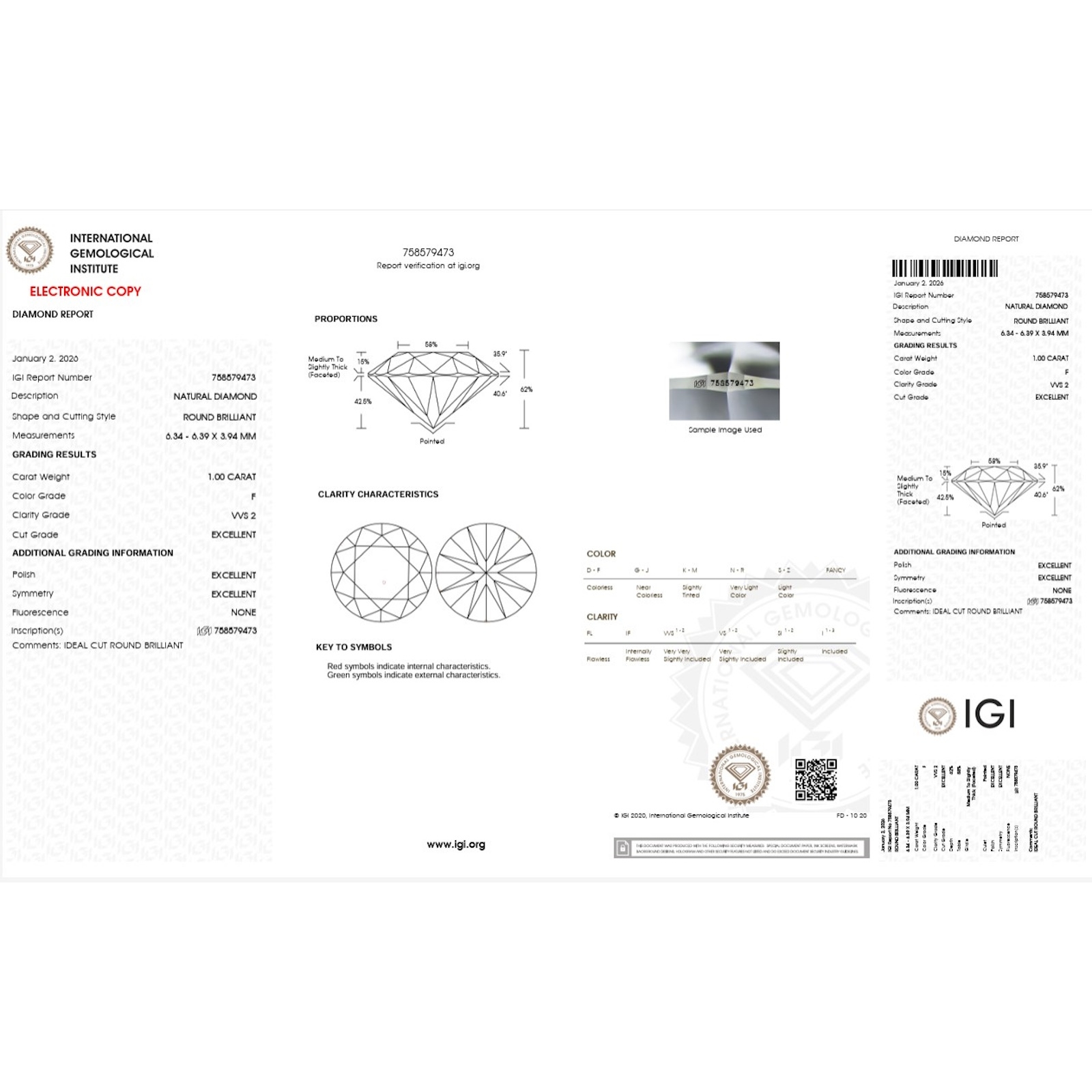 Diamant Certifié IGI 1.00 CT F VVS2