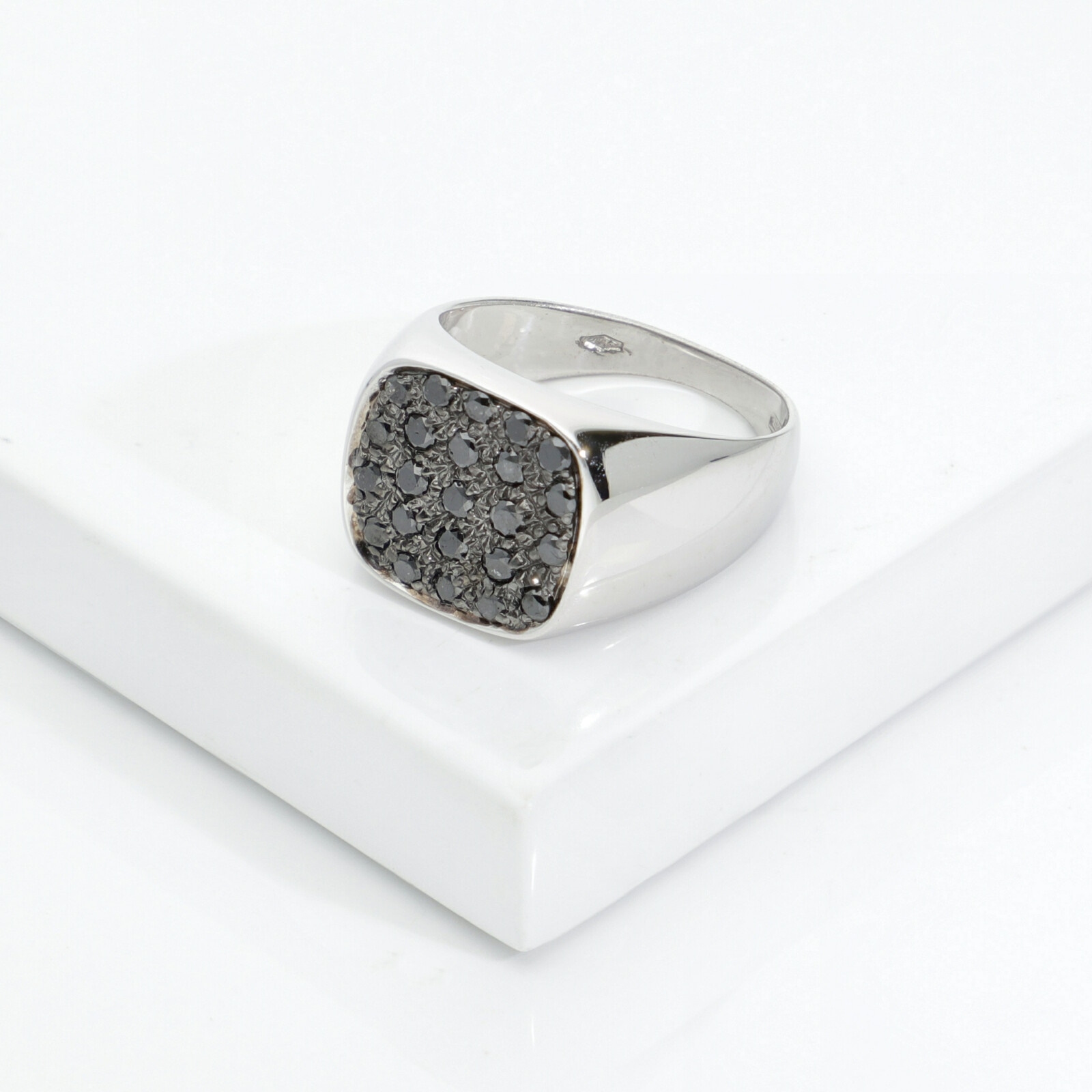 Bague chevalier en or blanc 18k avec pavé carré de diamants noirs