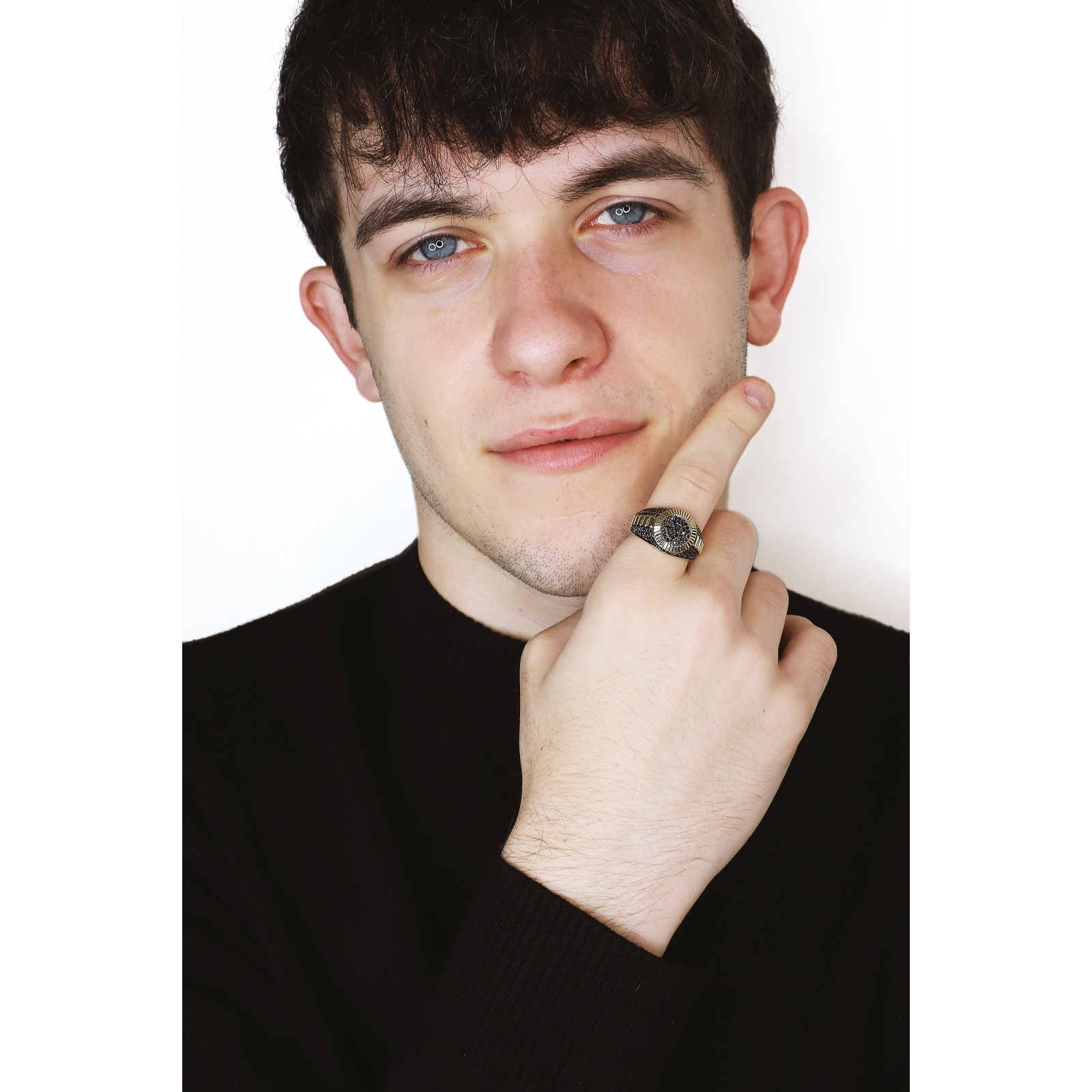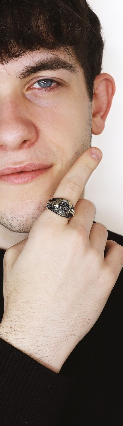 Bague masculine en or jaune 18k, ornée de zircones noires pour un contraste élégant et audacieux. Un bijou au style intemporel, parfait pour un look raffiné et moderne.