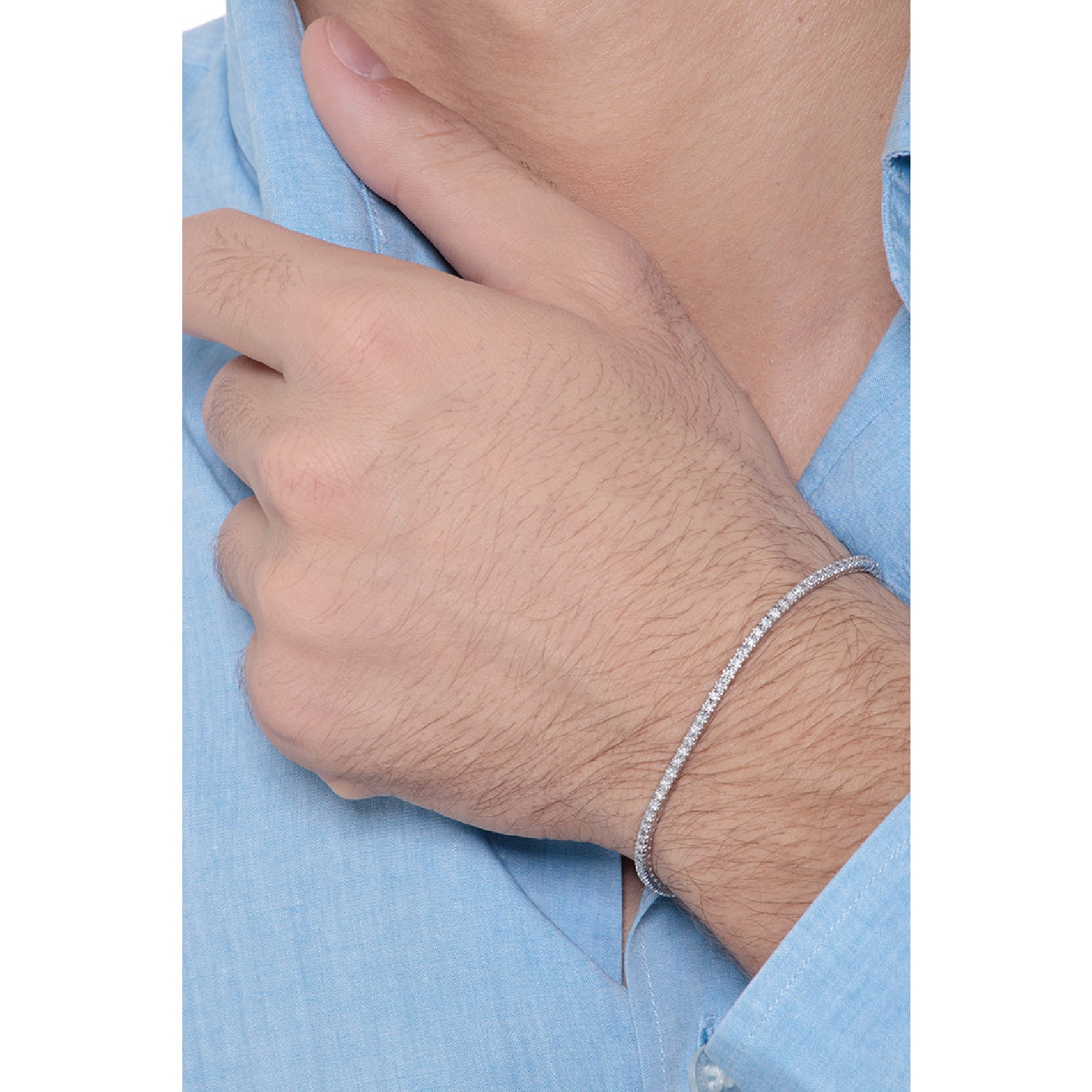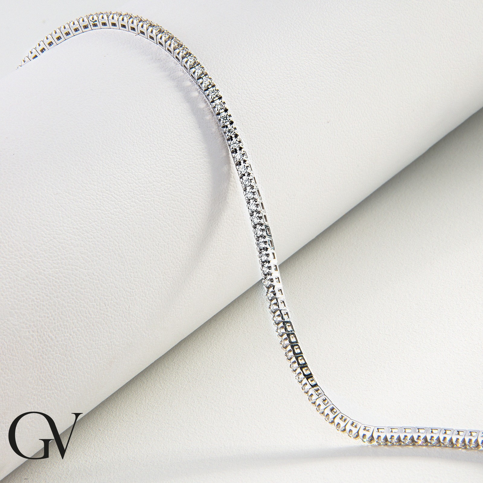Bracelet tennis en or blanc 18k serti de diamants de couleur H et de pureté VS. Le carat peut varier en fonction de la taille du bracelet. Largeur de la maille env. 2,05 mm.