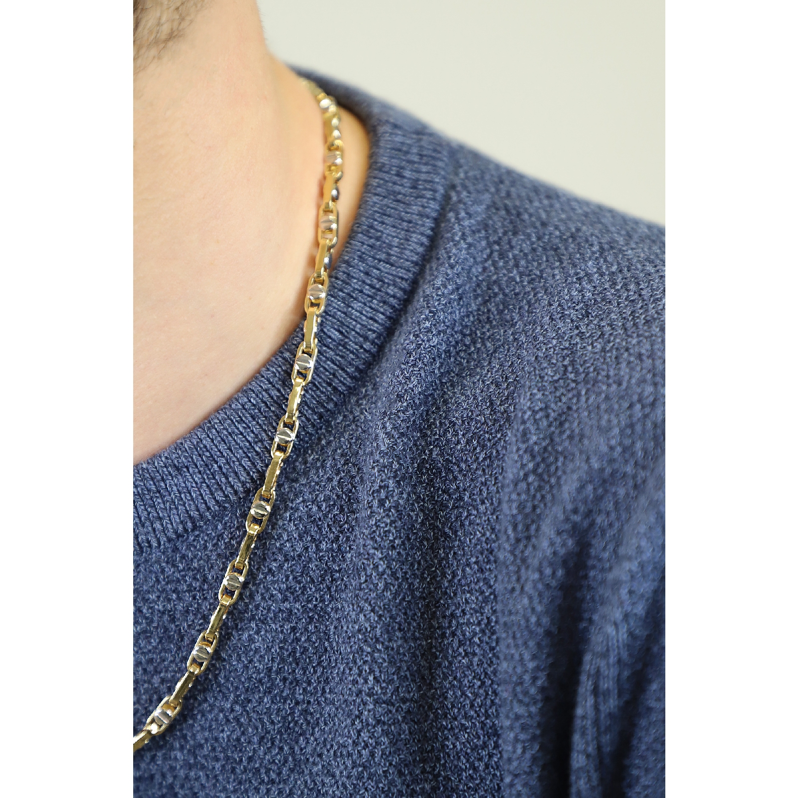 Collier en or jaune et blanc 18k orné de motifs tête de vis, longueur 50 cm, un bijou original et raffiné.