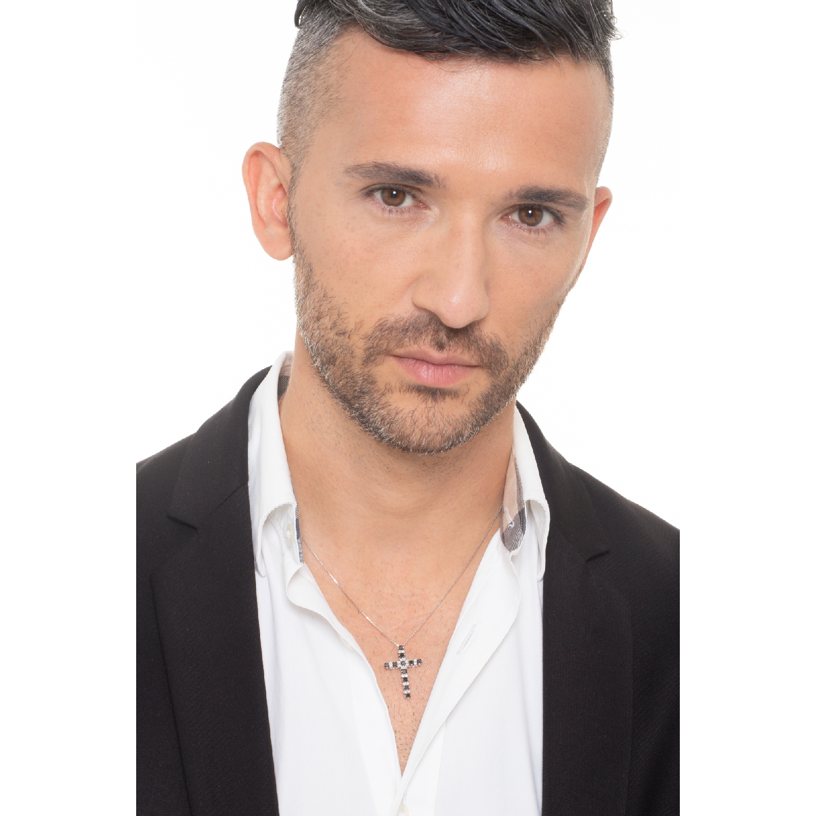 Collier pendentif croix or blanc 18k diamants noirs et blancs