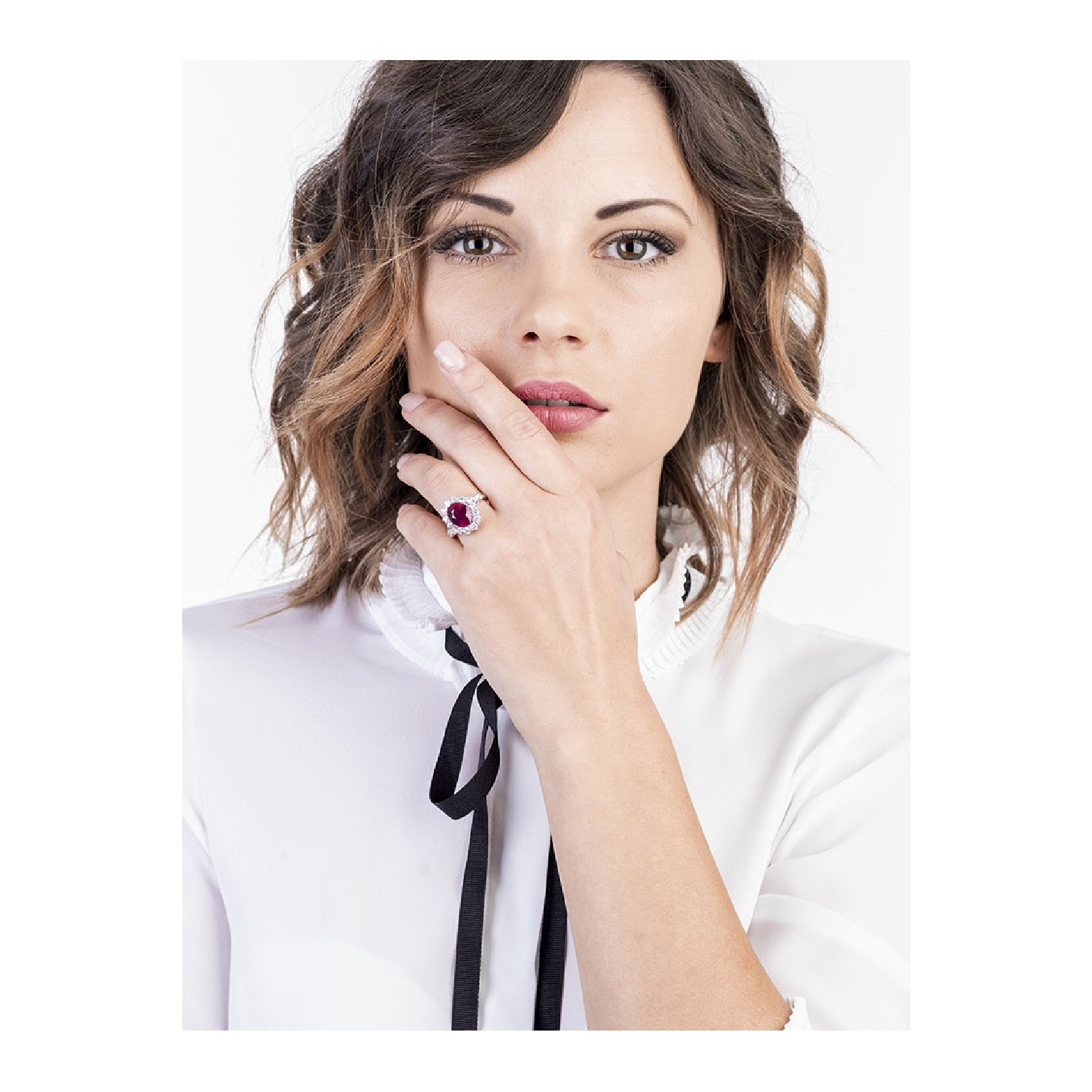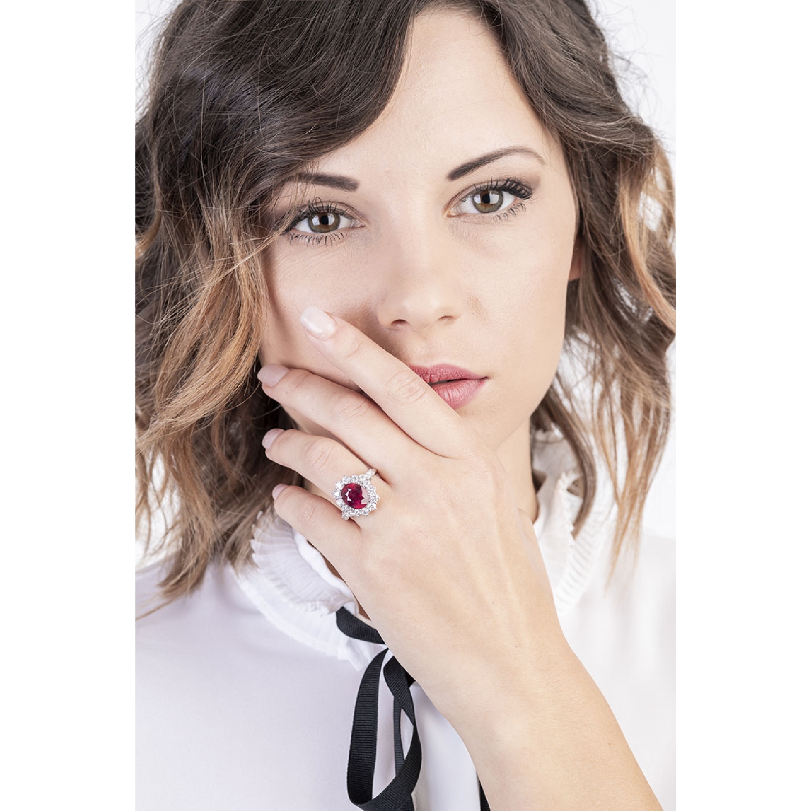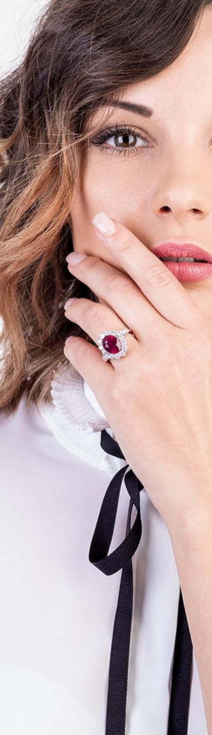 Bague avec rubis central en or blanc 18k entourée de diamants