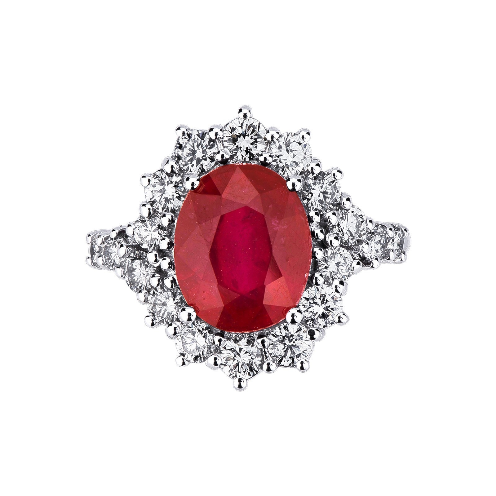 Bague en or blanc 18 carats, sertie au centre d'un rubis de taille ovale entouré de diamants H/VS.