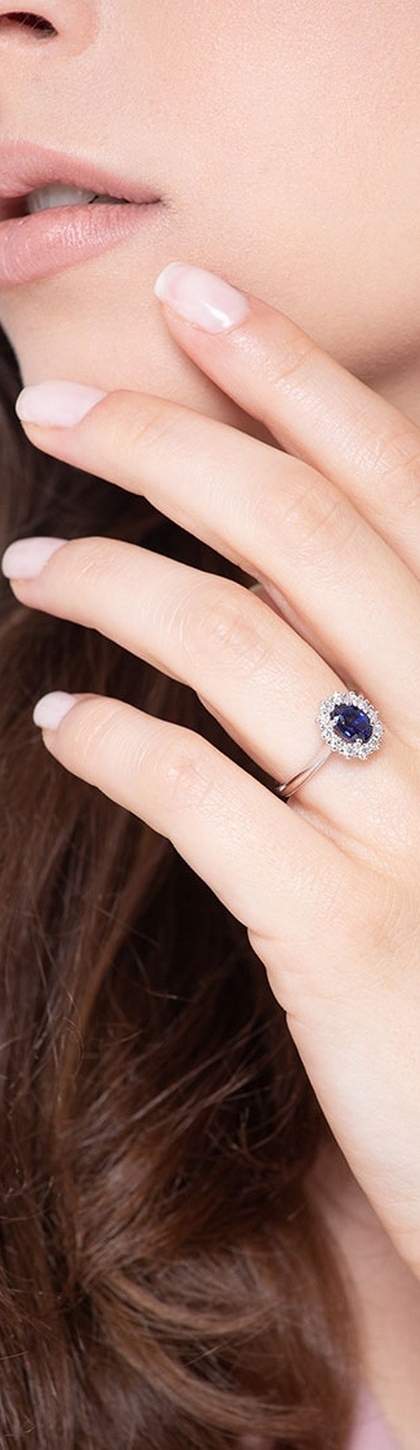 Bague avec saphir central ovale et halo de diamants en or blanc 18k