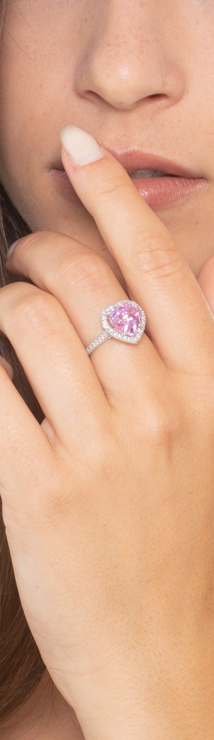 Bague en or blanc 18k avec un saphir rose taille coeur d'environ 10x10 mm, accompagne de diamants taille brillant couleur H et purete Vs.