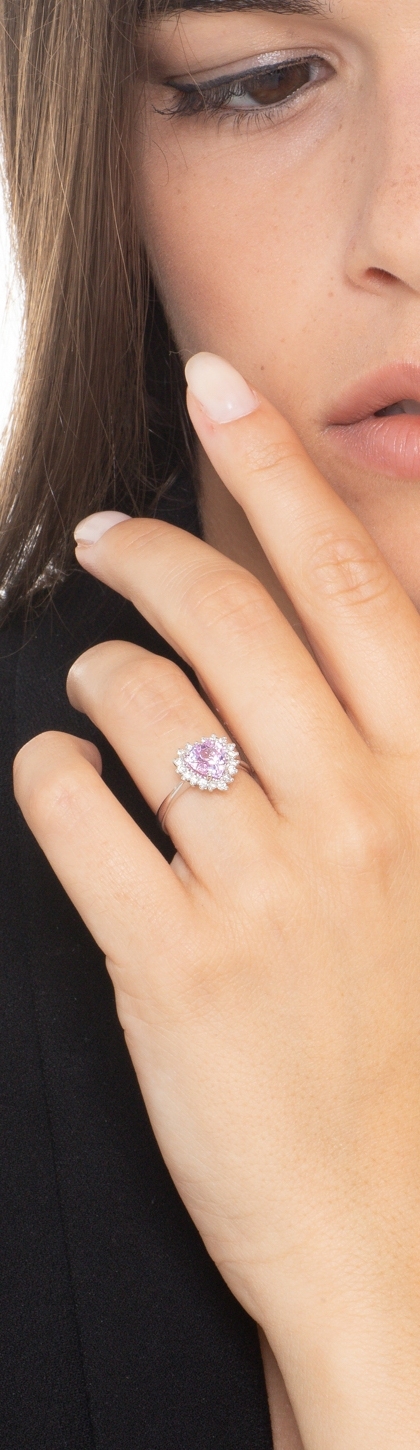 Bague en or blanc 18 carats avec saphir rose en forme de cœur d’environ 7 mm, accompagné de diamants taille brillant, couleur H et pureté VS.