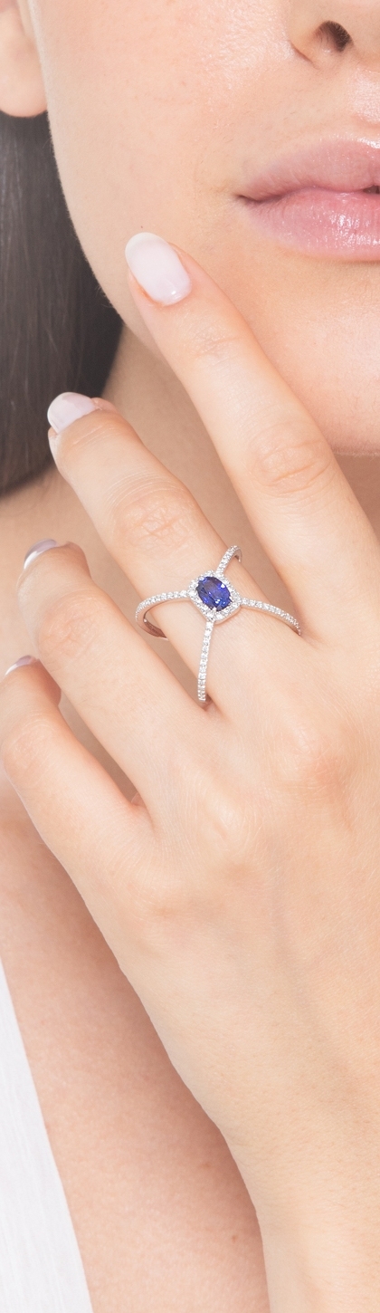 Bague croisée en or blanc 18k avec saphir bleu ovale et diamants