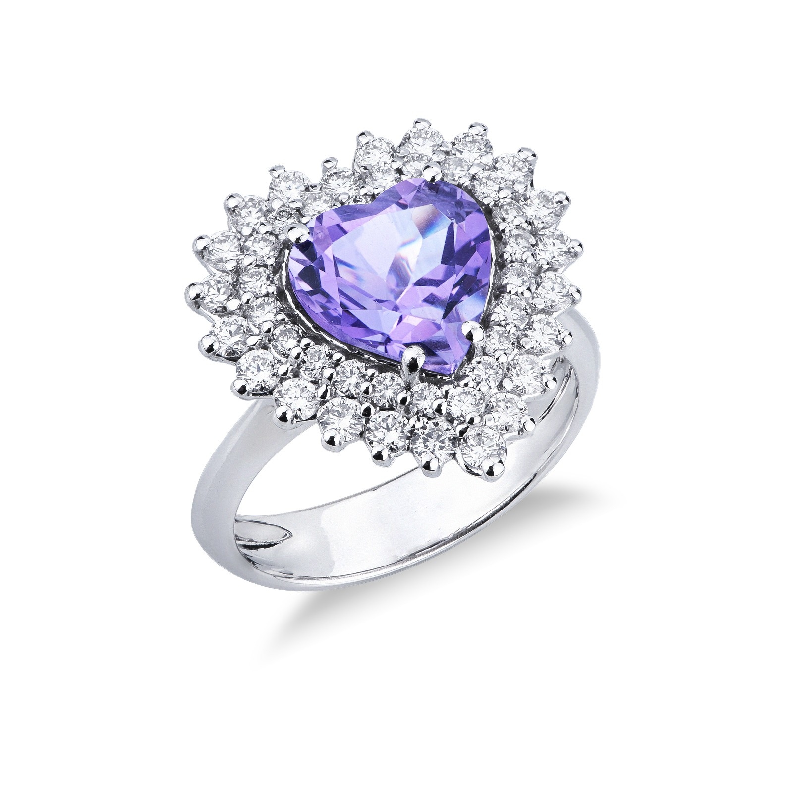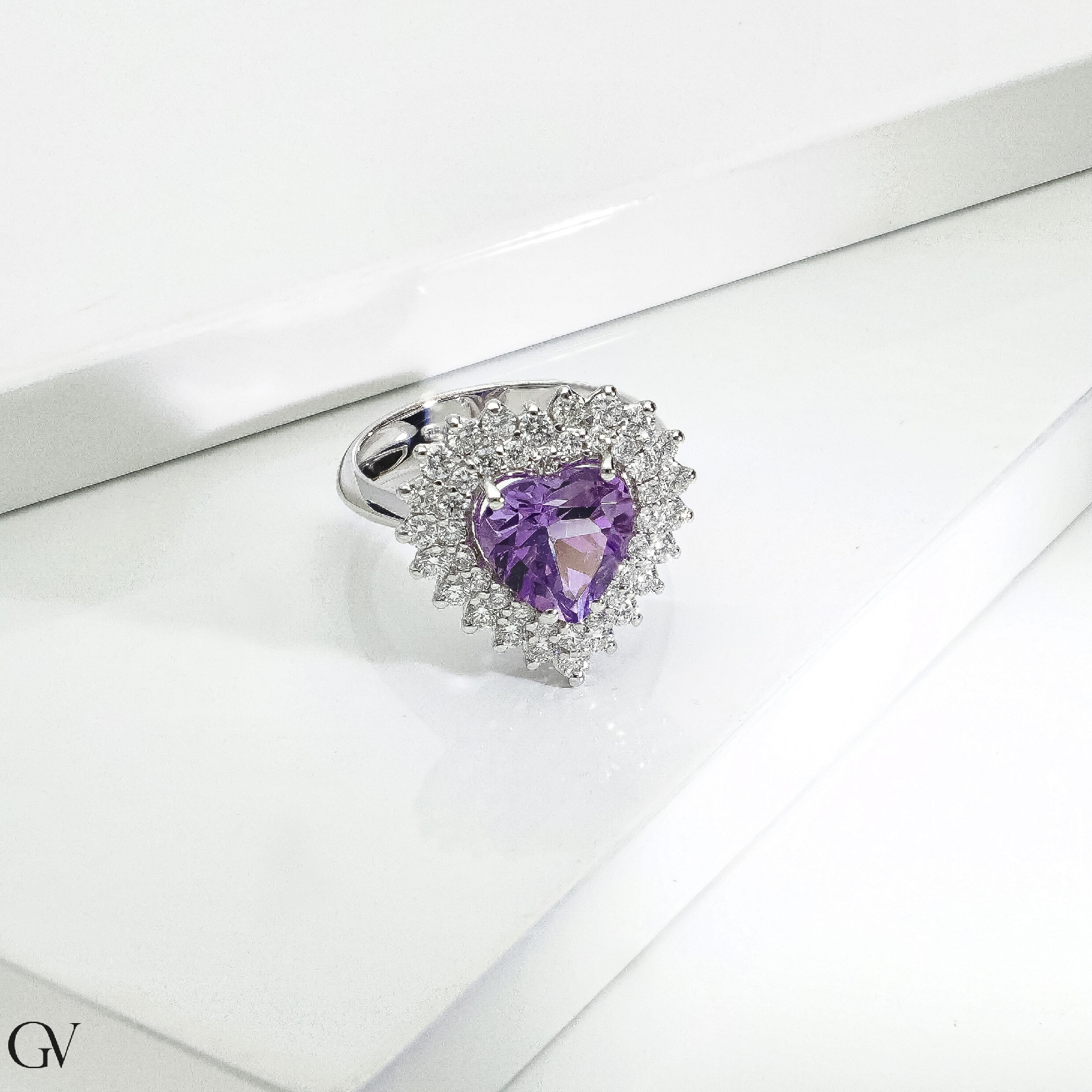 Bague en or blanc 18k avec améthyste taille cœur d’environ 9x9 mm et entourage de diamants taille brillant, couleur H et pureté VS