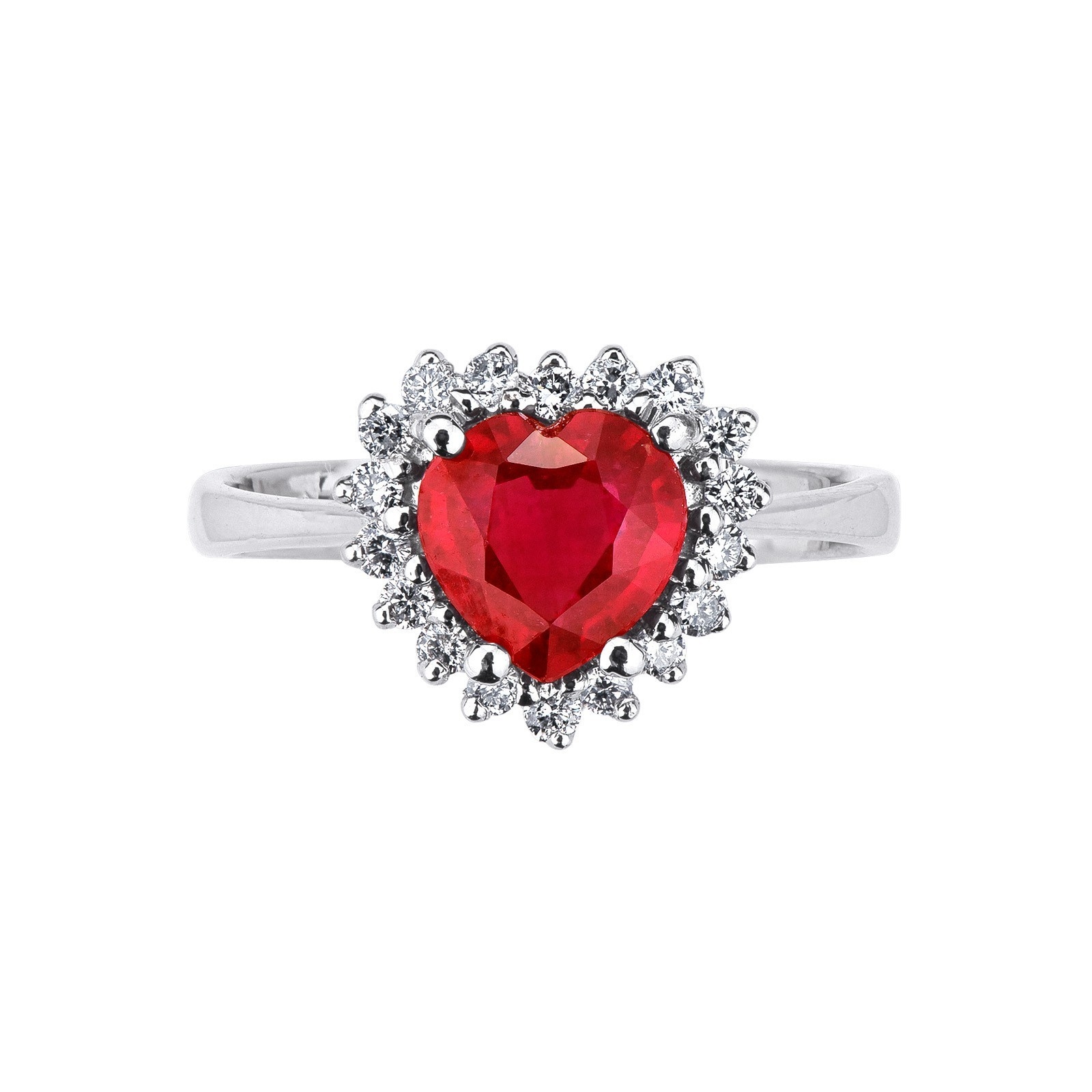 Bague en or blanc 18k avec halo de diamants et rubis en forme de coeur