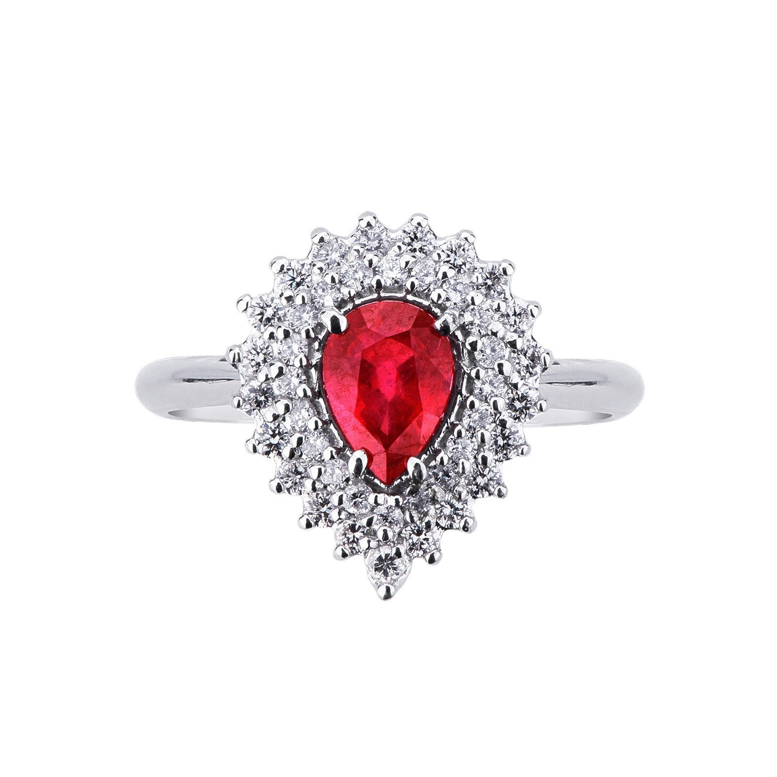 Un luxe eclatant alliant l’intensite du rubis et l’eclat des diamants. Cette bague en or blanc 18 carats presente un rubis taille goutte entoure d’un double rang de diamants taille brillant, couleur H et purete VS. Elegance et raffinement dans chaque detail.