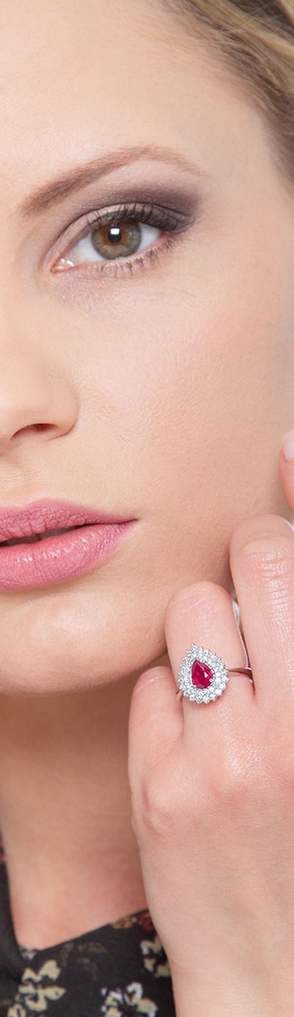 Bague en or blanc 18k avec rubis goutte et double rangée de diamants
