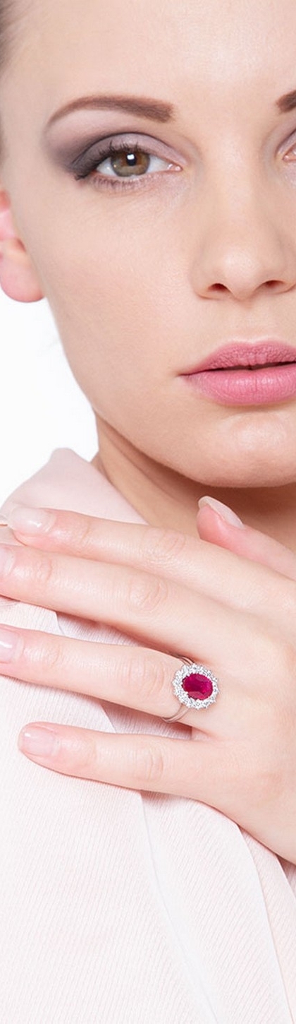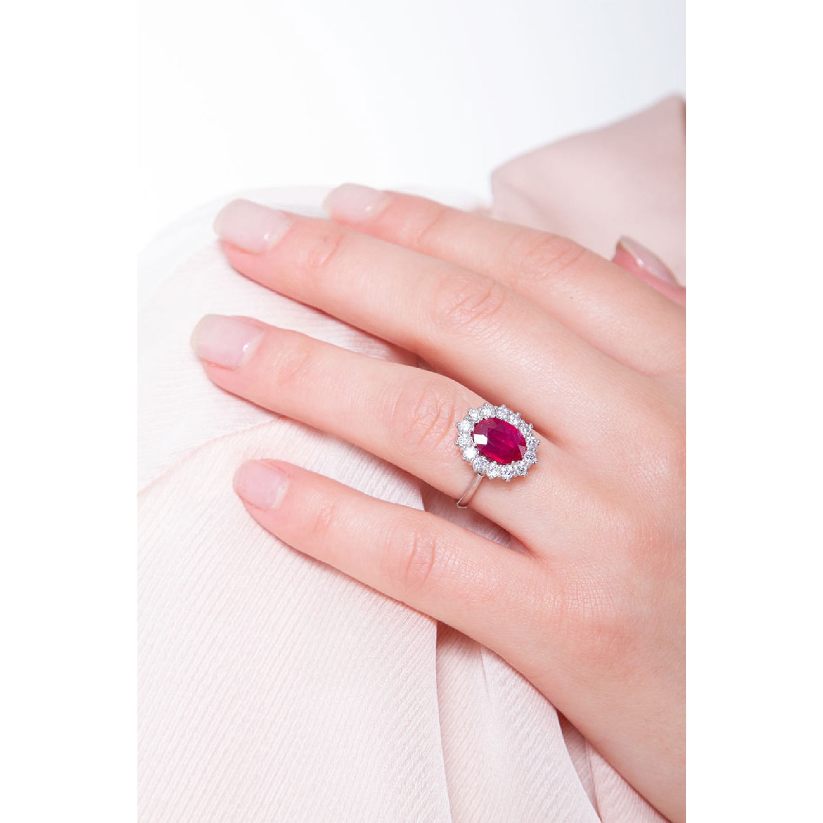 Bague en or blanc 18k avec rubis ovale et contour de diamants