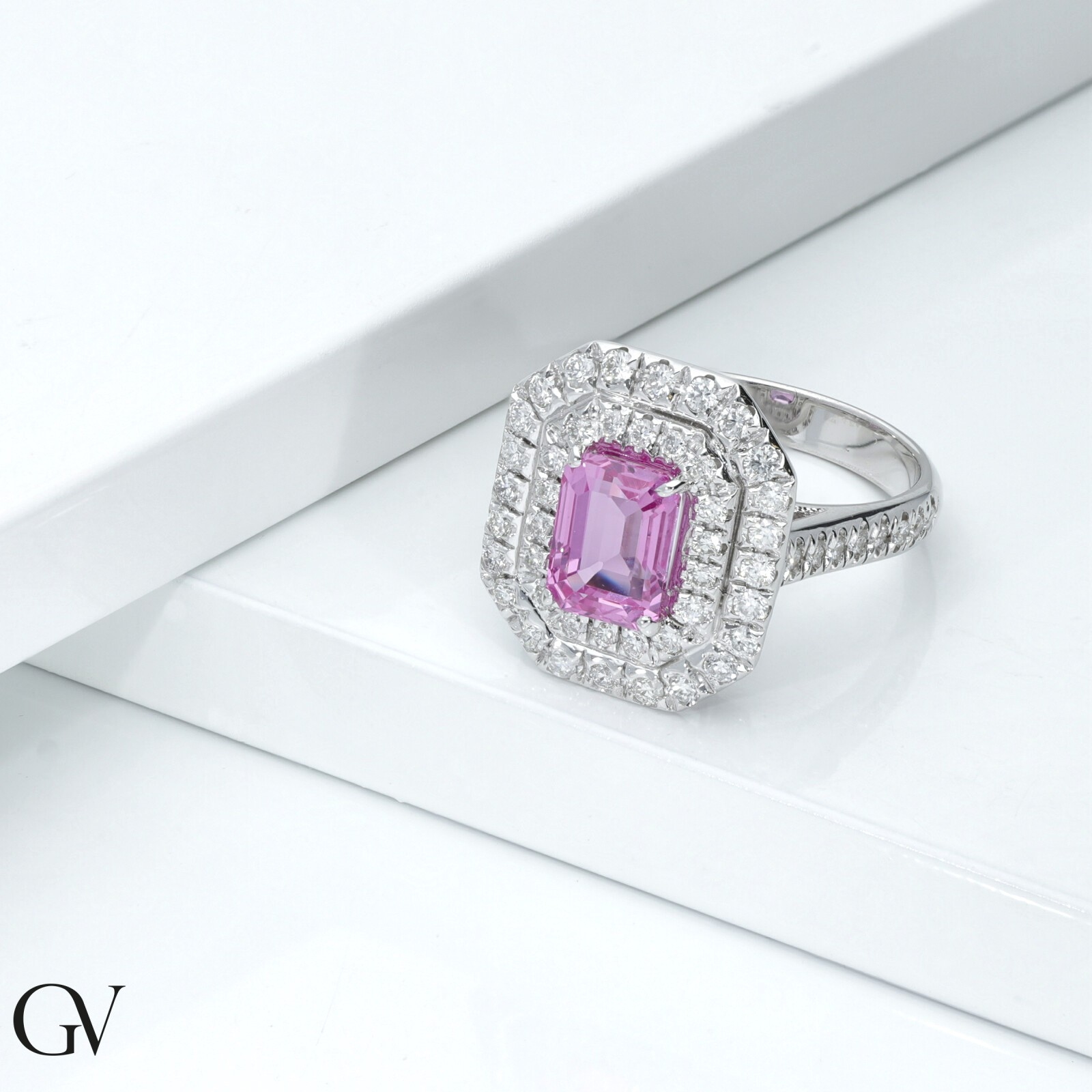 Un design unique qui allie douceur et éclat. Cette bague en or blanc 18 carats presente un saphir rose rectangulaire de 8x6 mm entoure d’un double contour octogonal de diamants taille brillant, couleur H et purete VS. Un bijou elegant et raffine pour les moments d’exception.