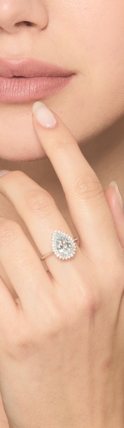 Bague en or blanc 18k avec une aquamarine goutte et 26 brillants