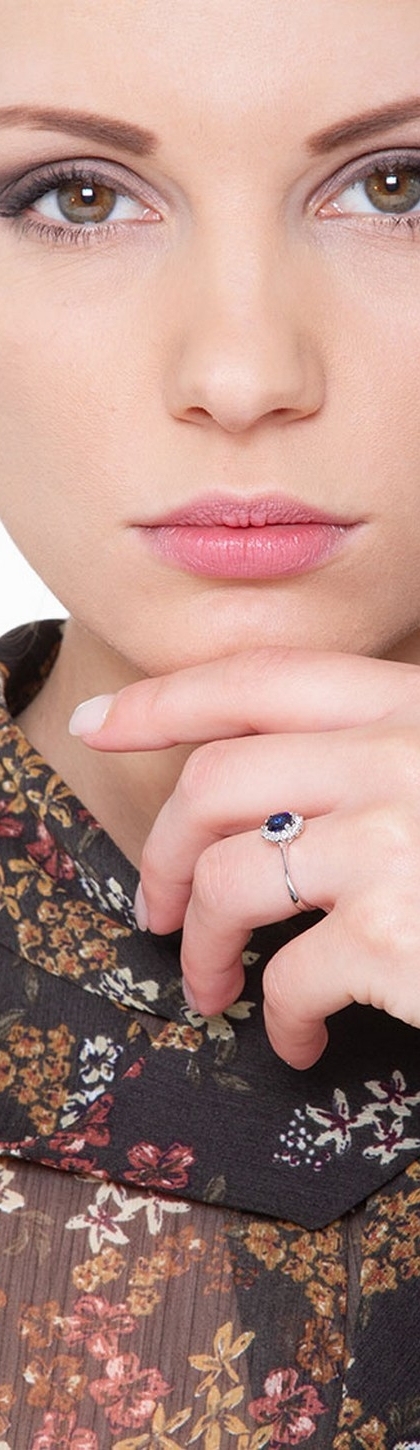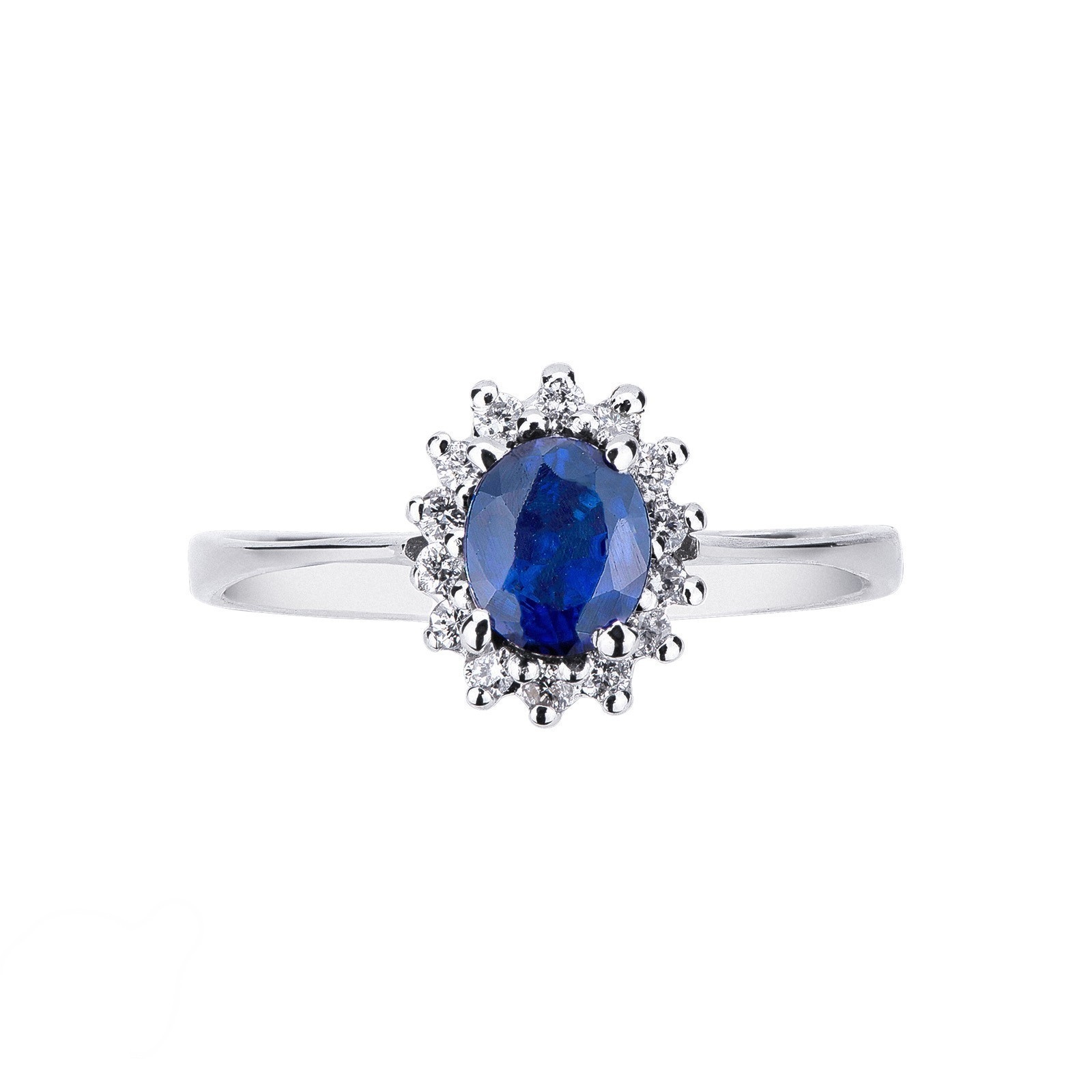 Bague en or blanc avec saphir bleu et halo de diamants