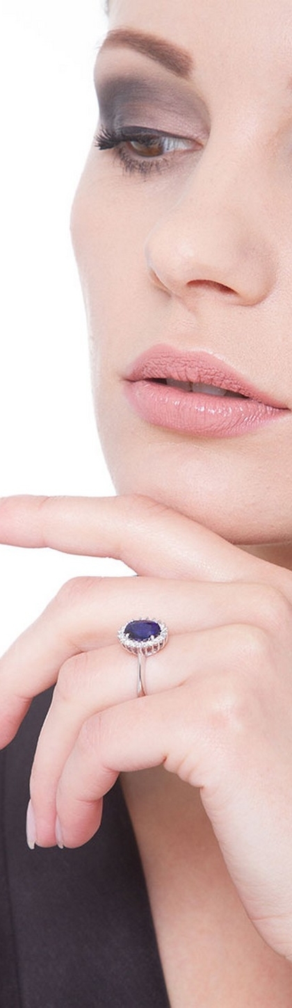 Bague en or blanc avec saphir bleu ovale et halo de diamants