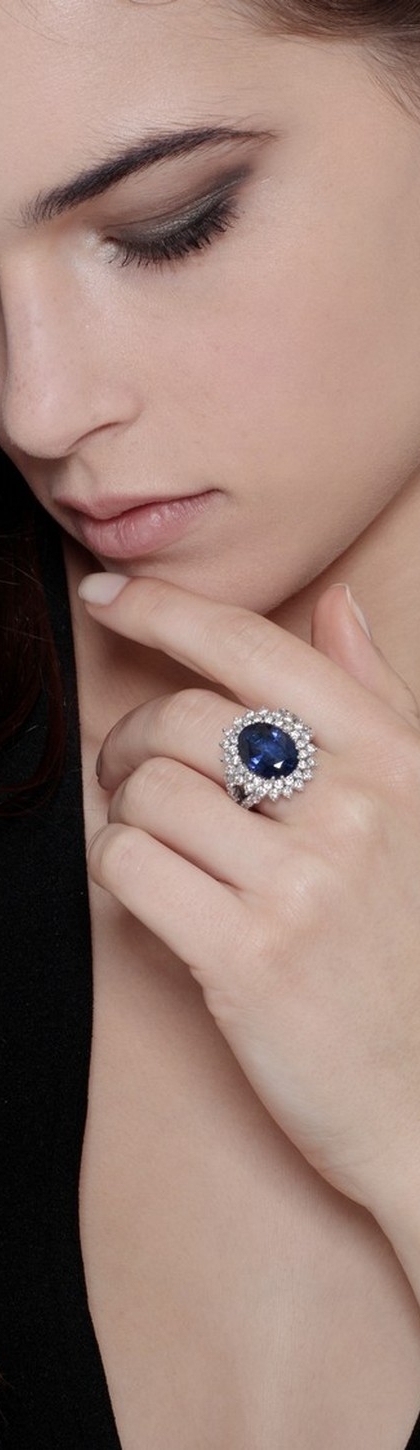 Bague entourage classique en or blanc 18k avec saphir bleu et diamants