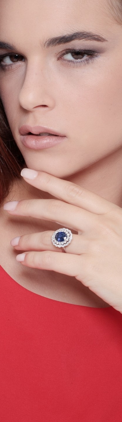 Bague halo double en or blanc 18k avec saphir bleu et diamants