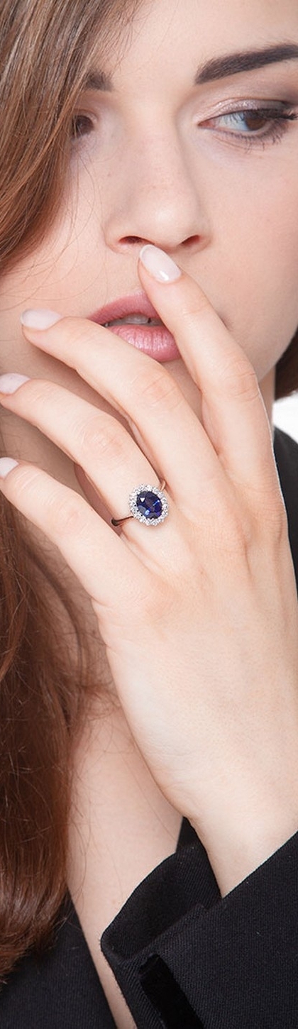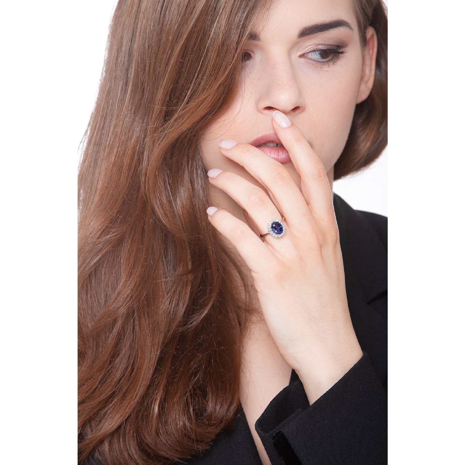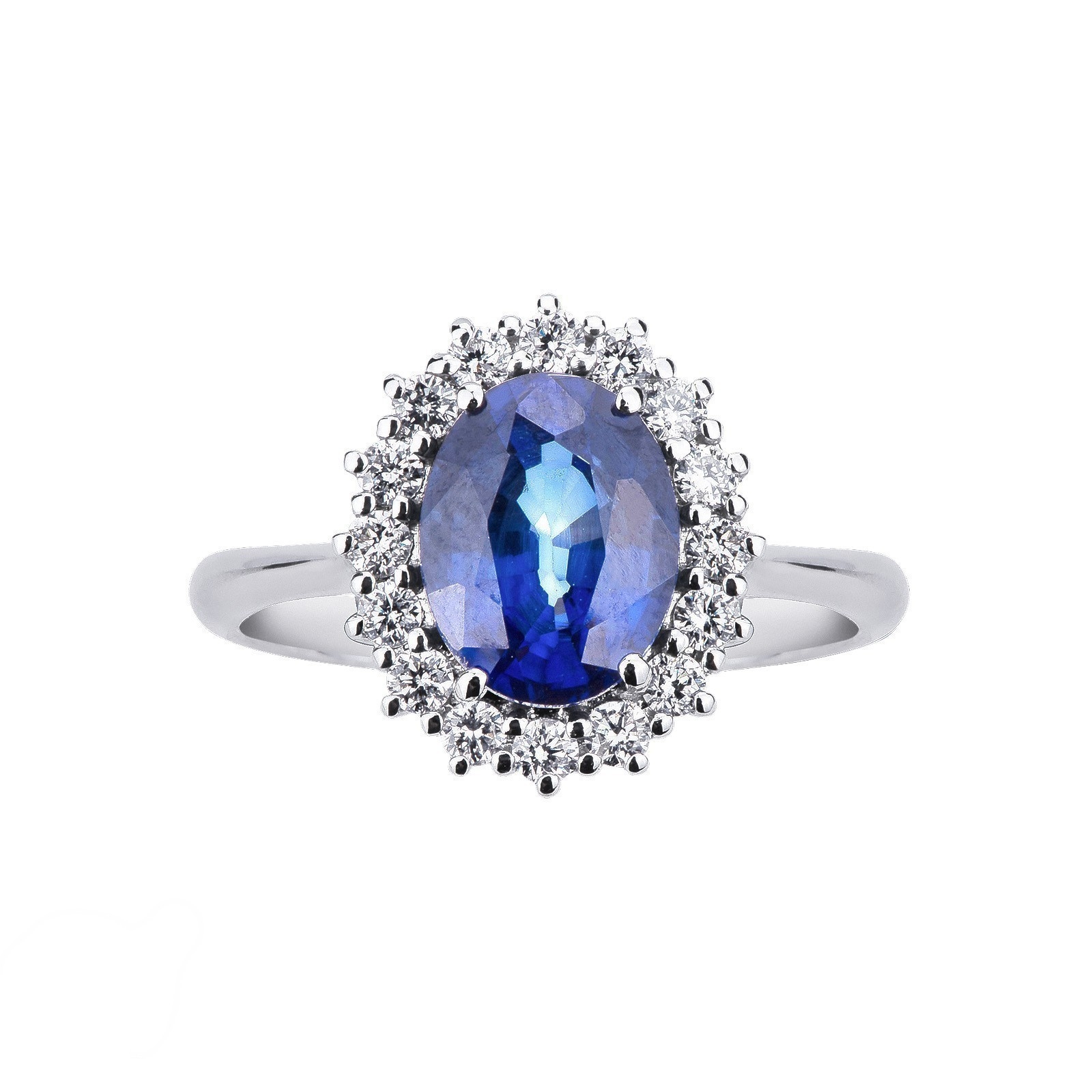 Bague halo en or blanc 18 carats avec des diamants et un saphir bleu ovale d'environ 9x7 mm