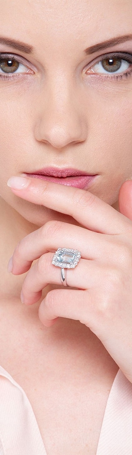 Bague halo en or blanc 18k avec aquamarine et diamants