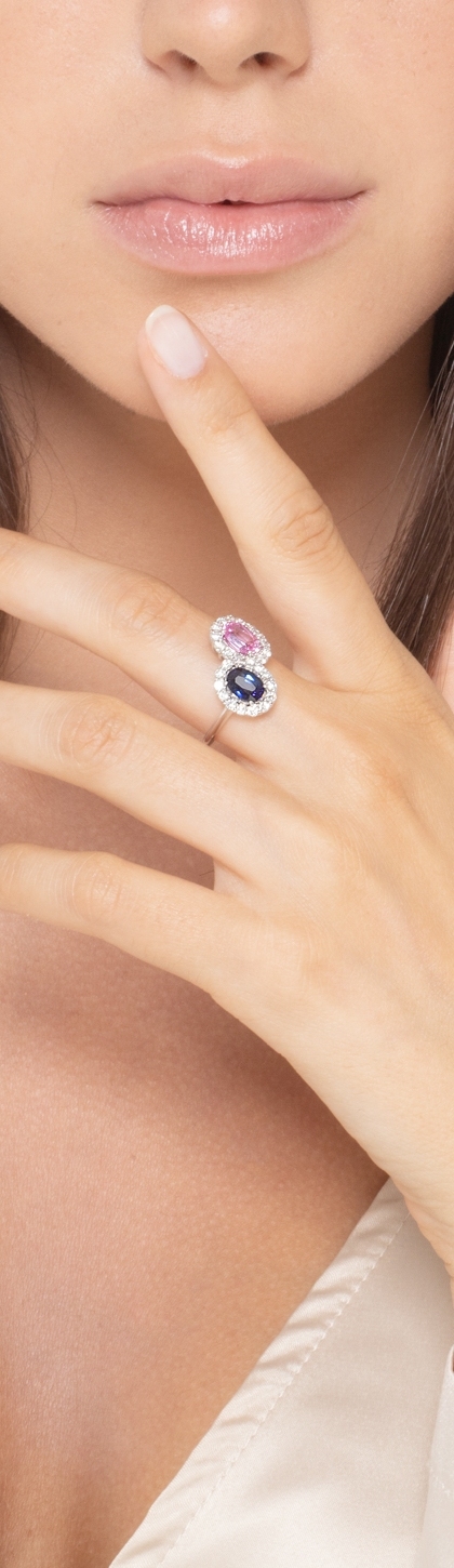 Bague halo en or blanc 18k avec saphirs rose et bleu