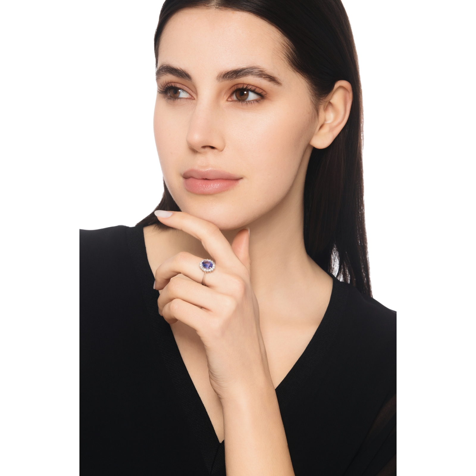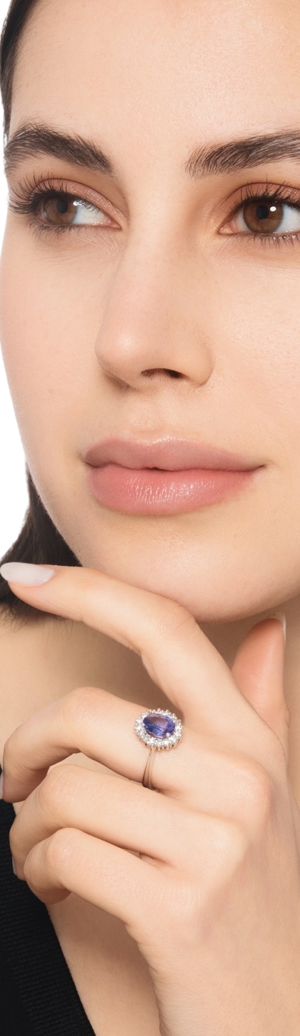 Bague halo en or blanc 18k avec Tanzanite et diamants.