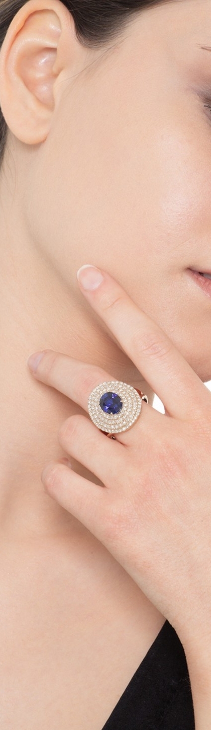 Bague halo en or rose 18k avec des saphirs bleus