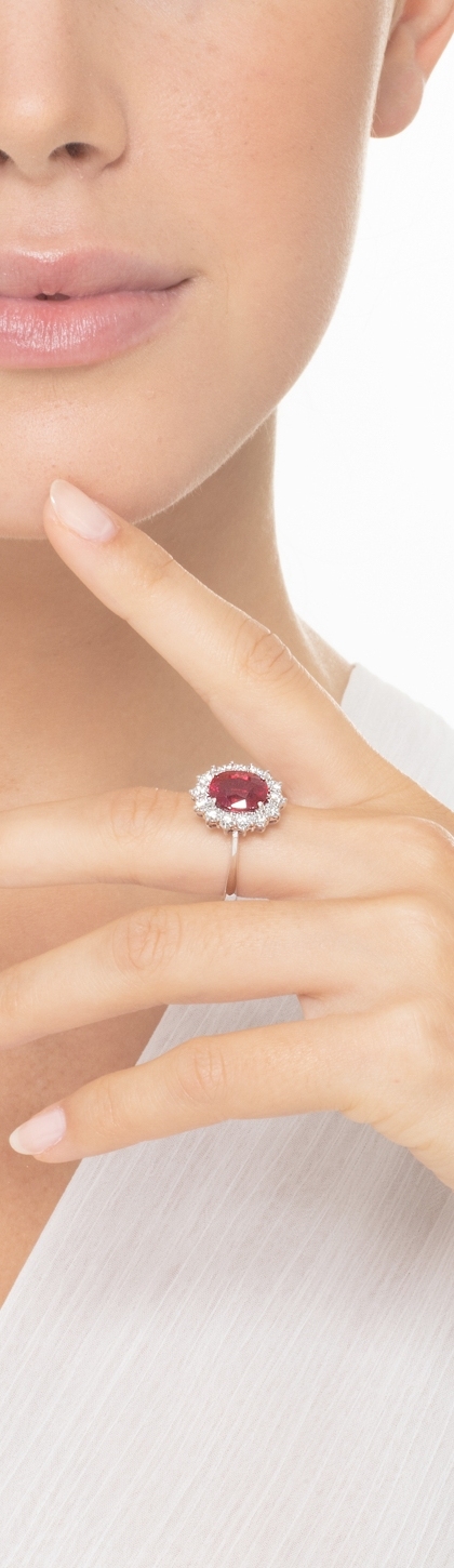 Bague Lady Di en or blanc 18k avec rubis ovale et diamants