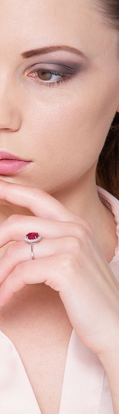 Bague or blanc 18k avec rubis et halo diamants