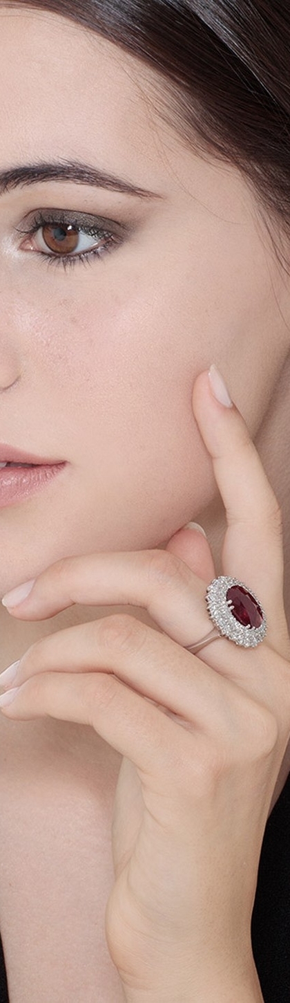 Bague rubis ovale sertie d'une double rangée de diamants et or blanc 18k