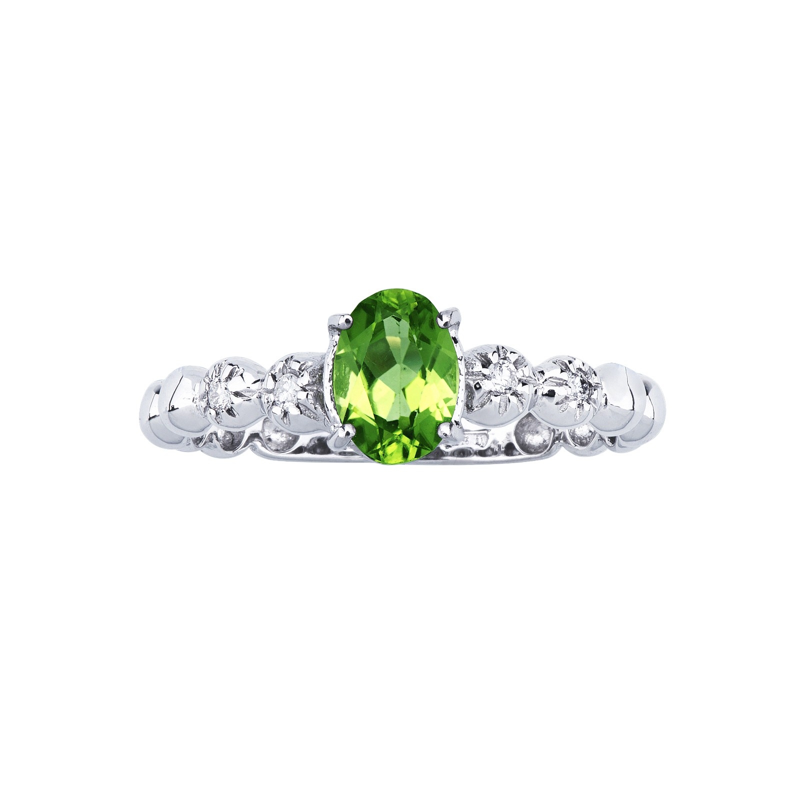 Bague en or blanc 18 carats avec un péridot ovale d'environ 7x5 mm et des diamants taille brillant.