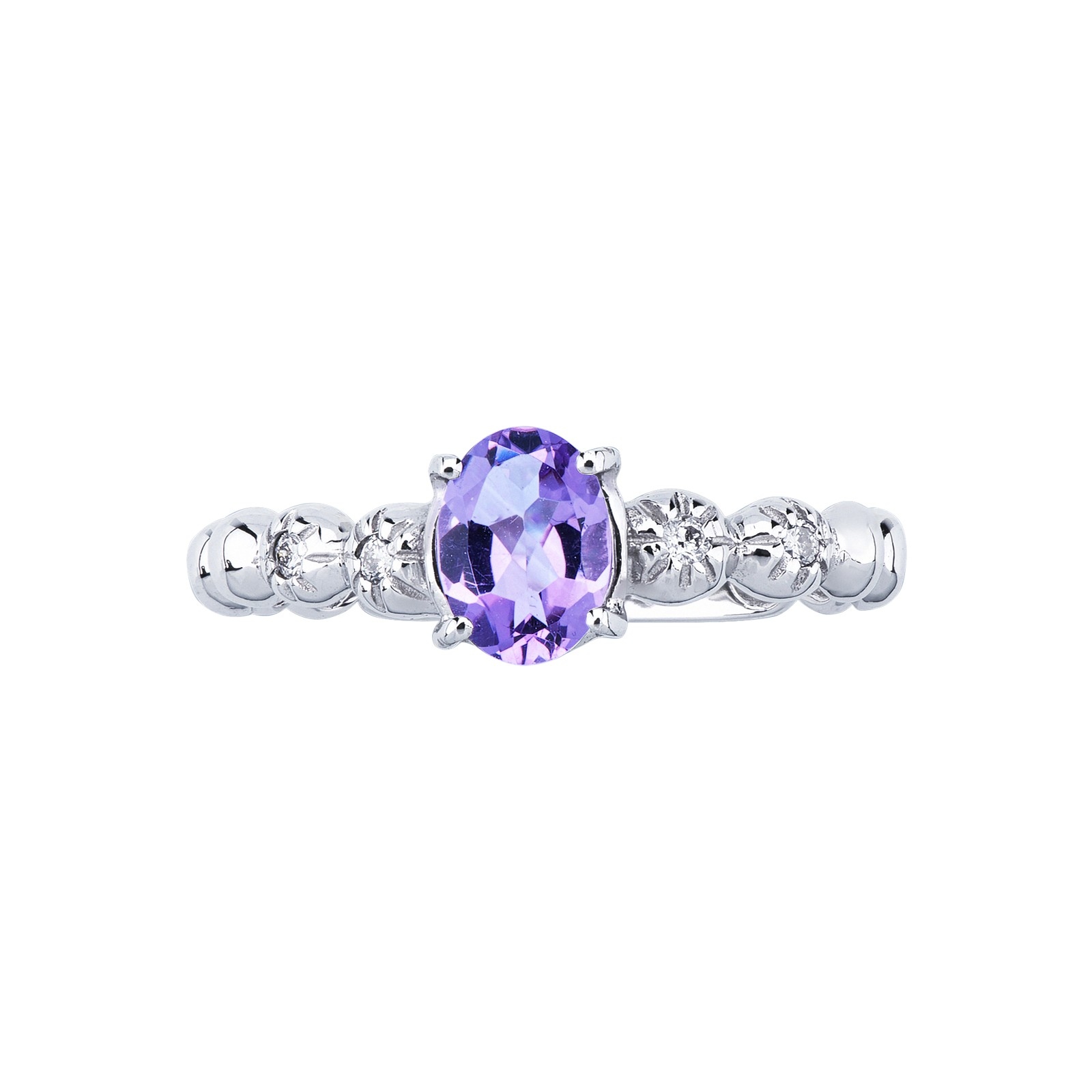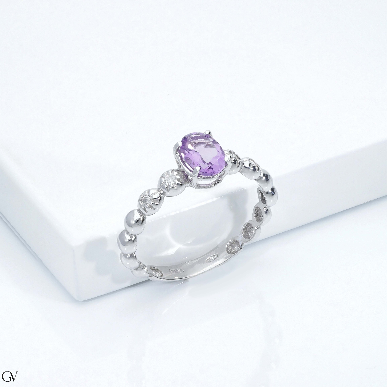 Bague en or blanc 18 carats avec une améthyste ovale d'environ 7x5 mm et des diamants taille brillant.