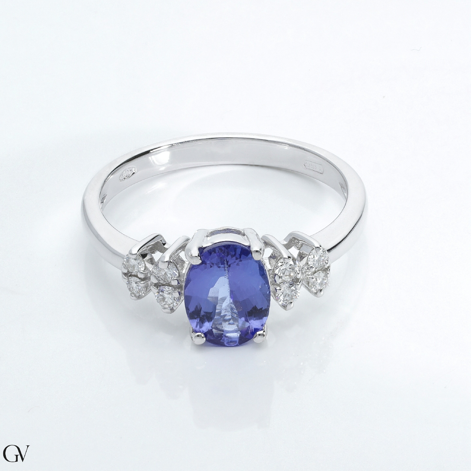 Bague en or blanc 18k avec diamants taille brillant, couleur H, pureté VS et tanzanite ovale d’environ 8x6 mm.