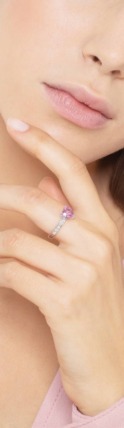 Bague en or blanc 18k avec un saphir rose en forme de cœur et des diamants sur la monture