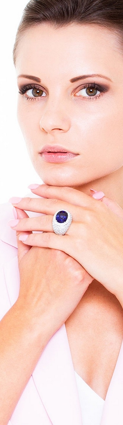 Bague femme en or blanc 18k avec saphir bleu ovale et pavé de diamants