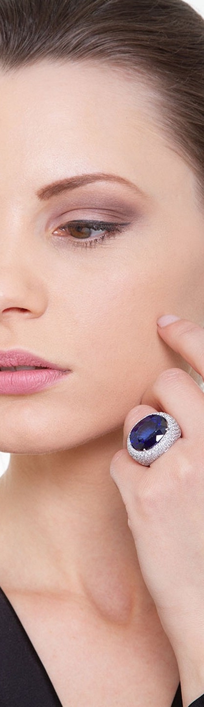 Bague femme en or blanc 18 carats avec saphir bleu central taille ovale, entouré d’un pavage de diamants taille brillant, couleur H et pureté VS.