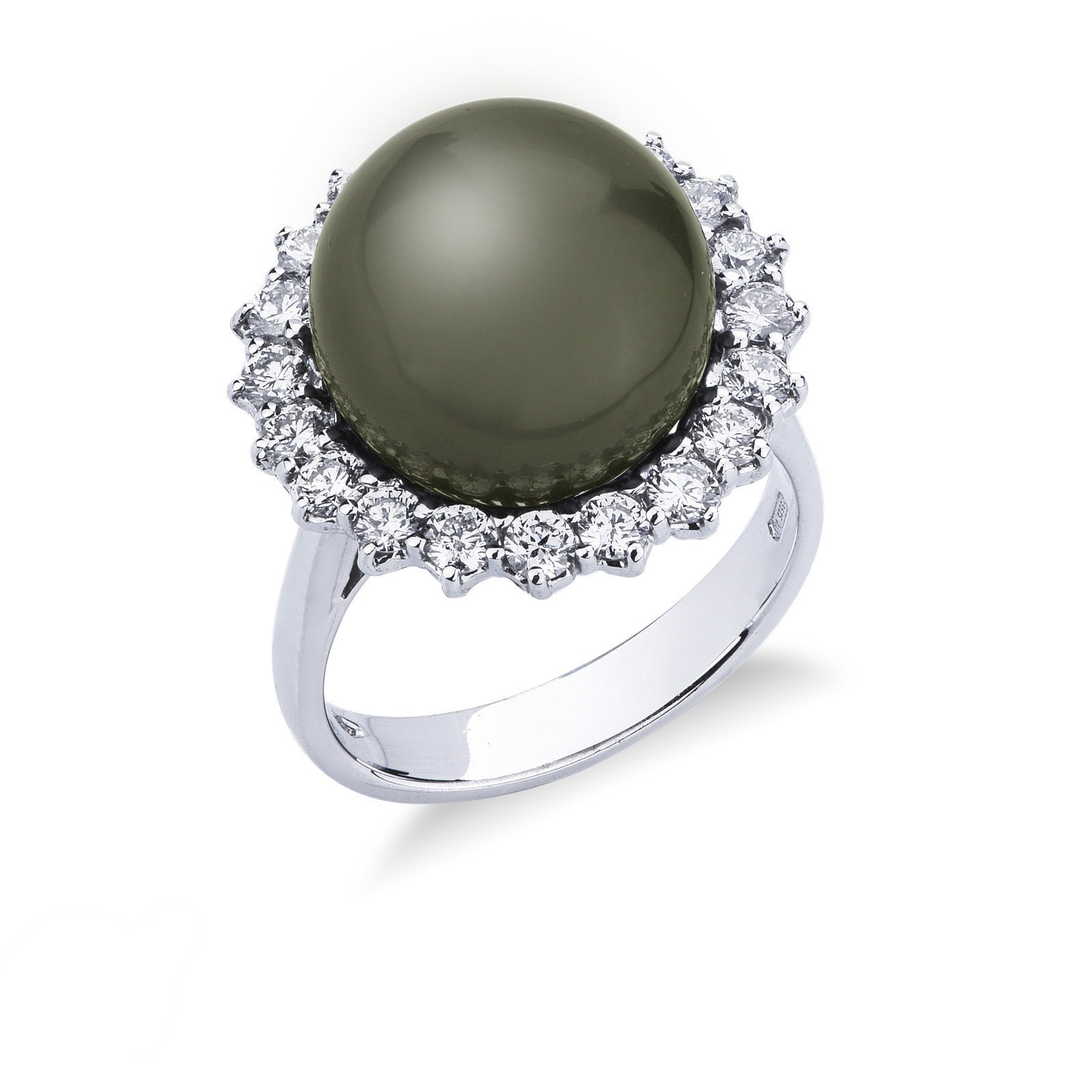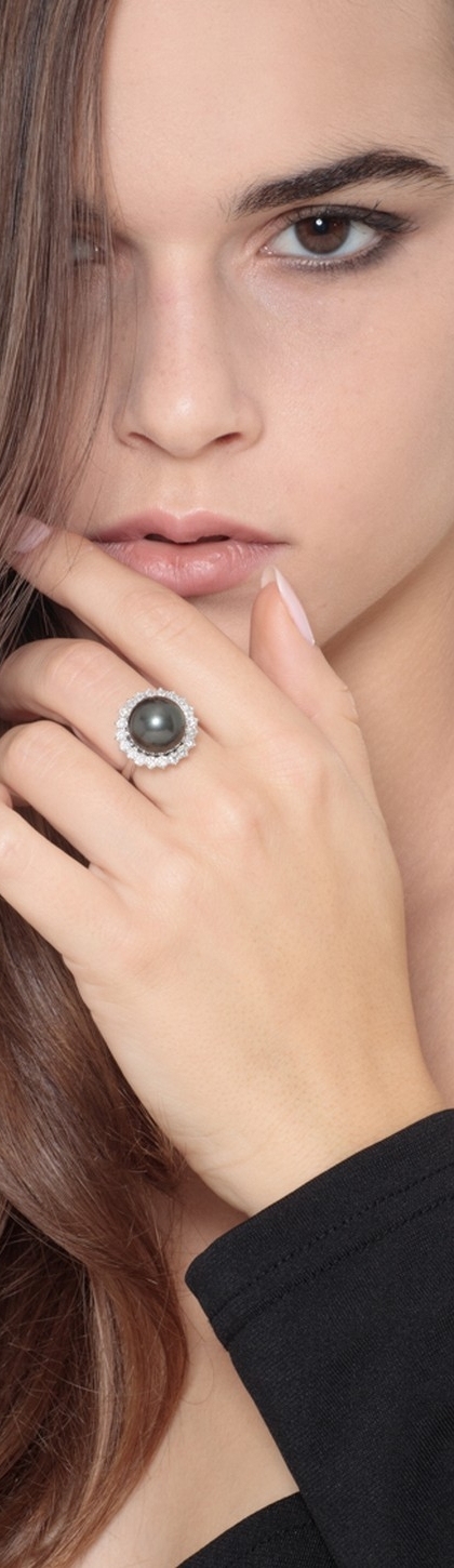 Bague en Or Blanc 18k avec Perle de Tahiti et Halo de Diamants