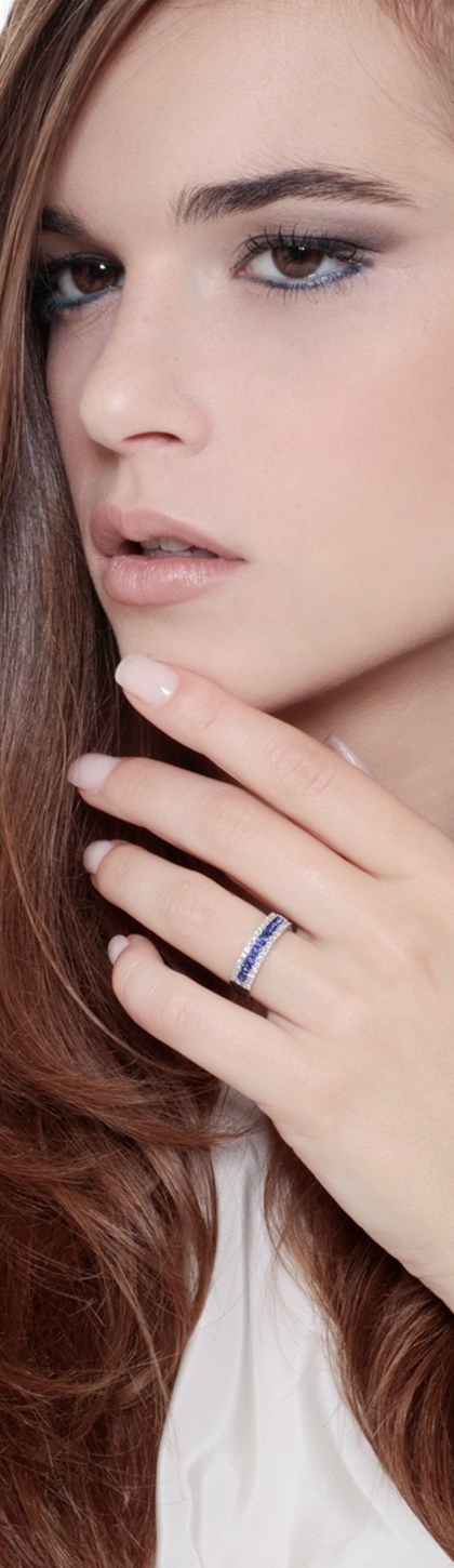Bague bande centrale avec diamants et saphirs en Or 18k