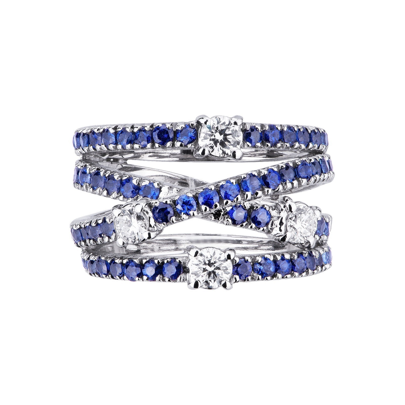 Bague bandeau en or blanc 18k avec saphirs bleus et diamants croisés