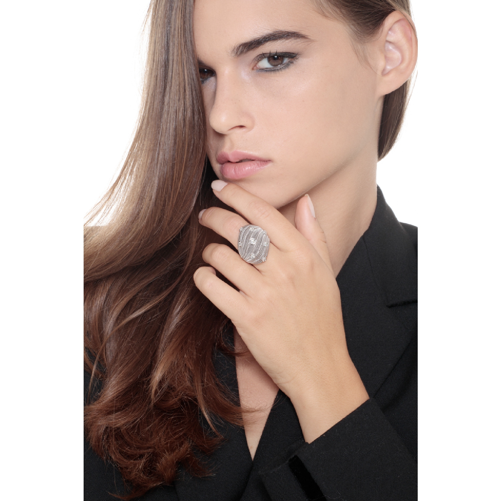 Bague fantaisie à bande en or blanc 18 carats, sertie de diamants taille brillante couleur H et pureté VS. Un bijou élégant et moderne qui allie un design créatif à l’éclat des diamants, idéal pour celles et ceux qui recherchent une bague distinctive et raffinée, parfaite au quotidien comme pour des occasions spéciales.
