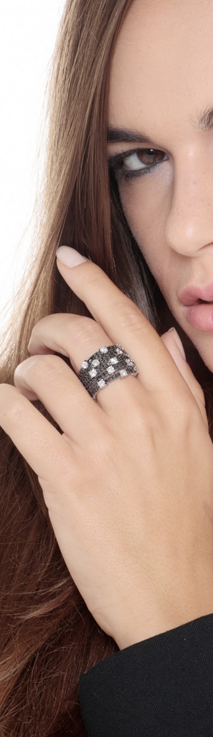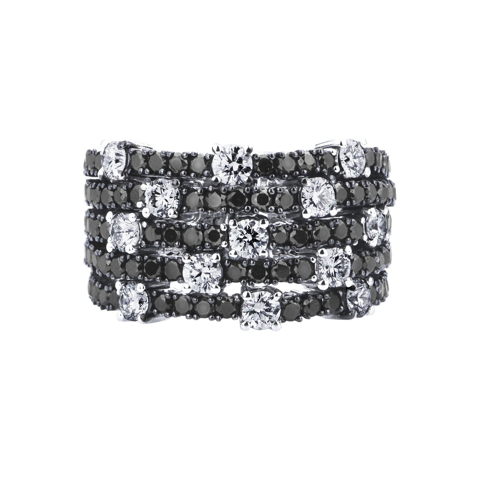 Bague en Or Blanc 18k avec cinq rangs de diamants noirs et blancs