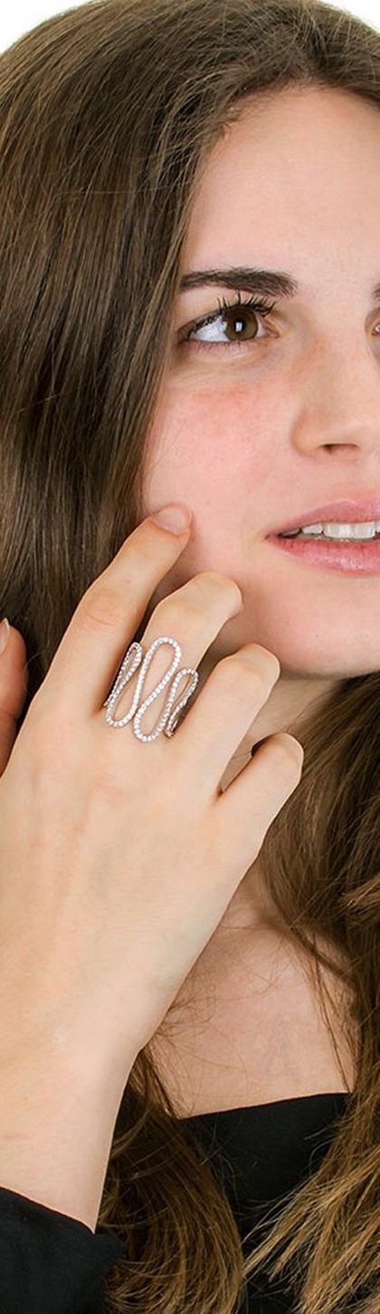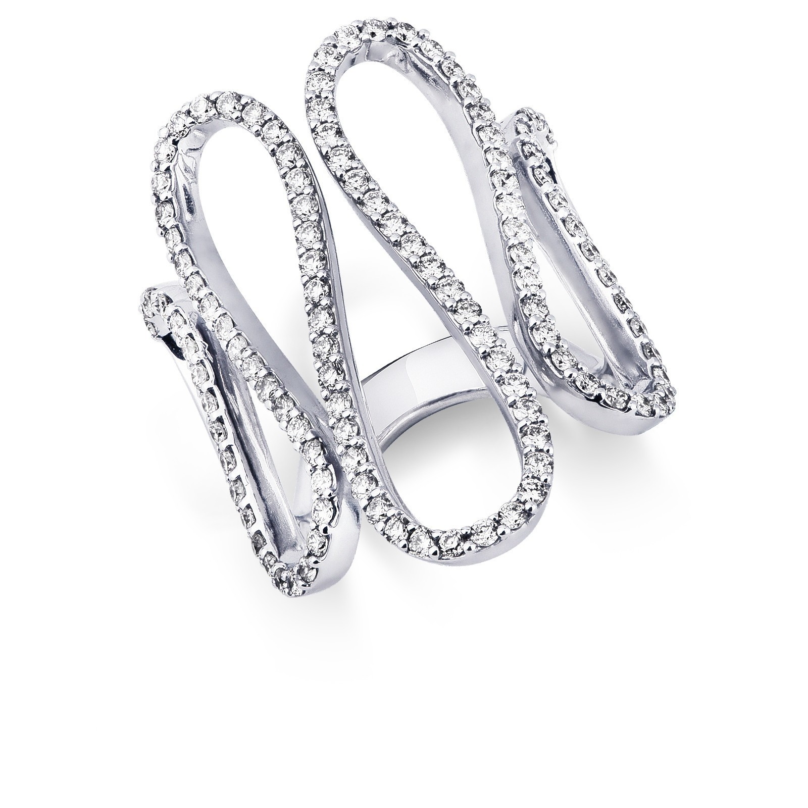Bague en or blanc 18 carats avec un design ondulé serti de diamants taille brillante couleur H et pureté VS. Un bijou féminin et raffiné qui allie élégance et éclat, idéal pour celles et ceux qui recherchent une bague moderne et distinctive, parfaite au quotidien comme pour des occasions spéciales.