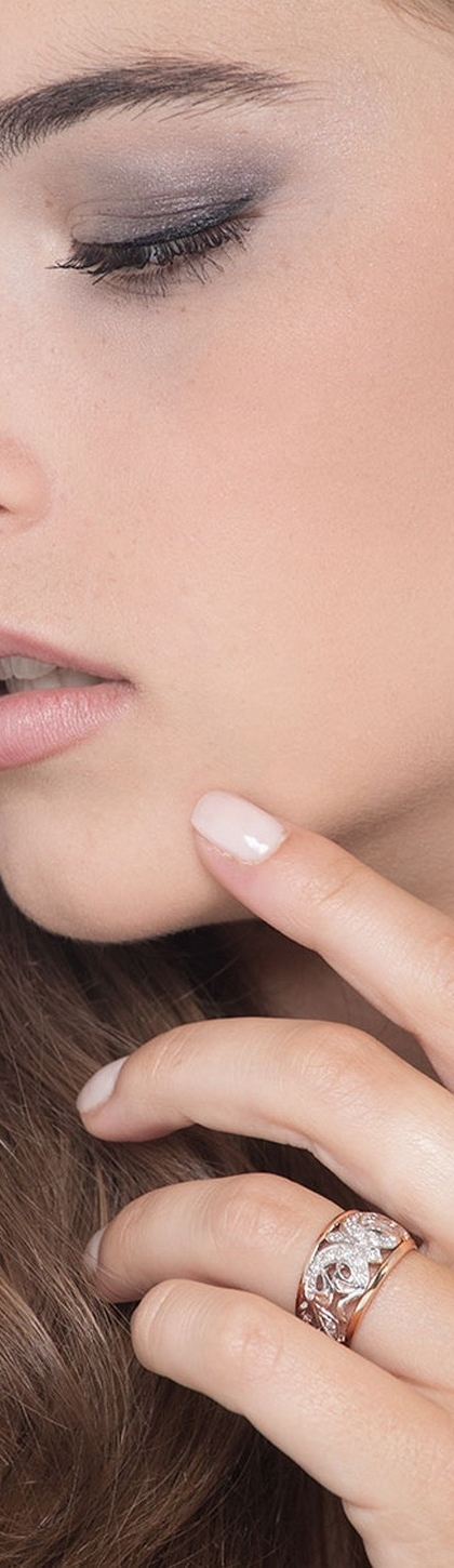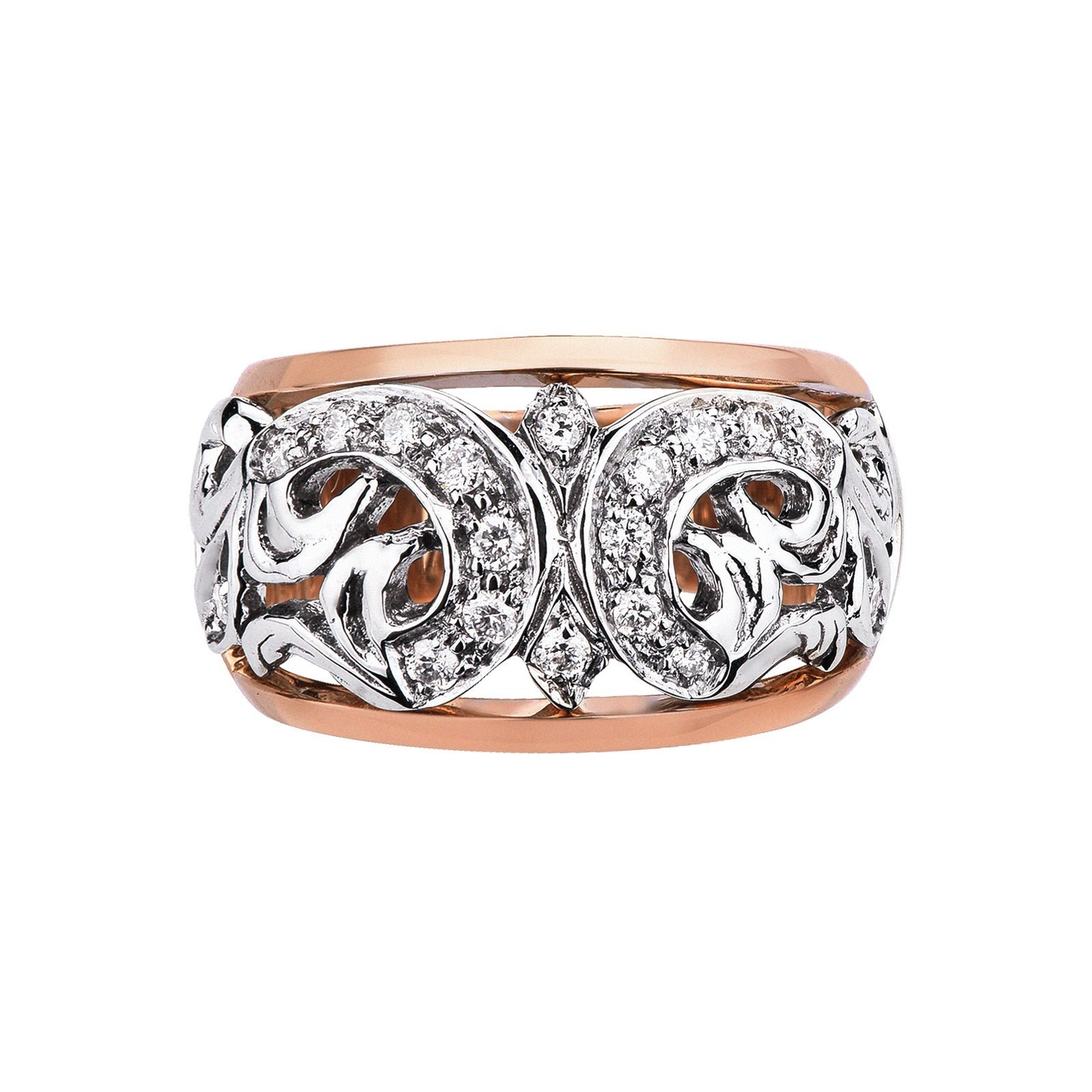 Bague femme en or blanc et rose 18 carats sertie de diamants taille brillant, couleur H et pureté VS. Ses volutes délicates serties de diamants rappellent les lignes élégantes de l’art baroque, créant un bijou raffiné et intemporel, idéal à porter en toute occasion spéciale.