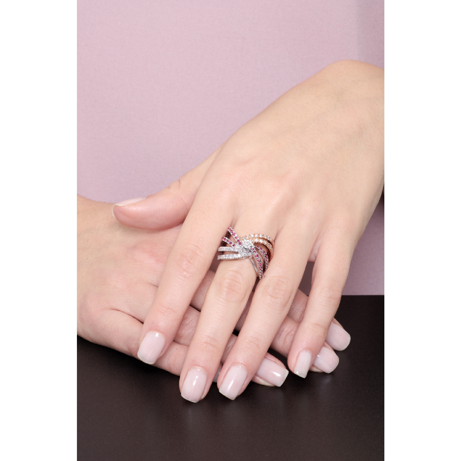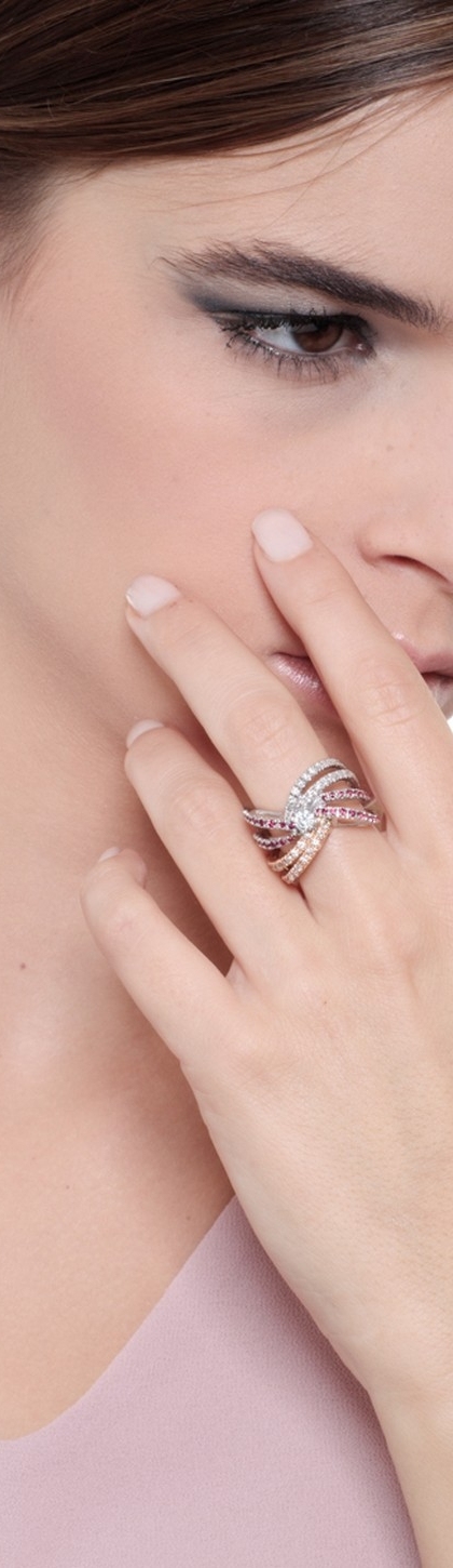 Bague jonc en or blanc et rose avec diamants et rubis