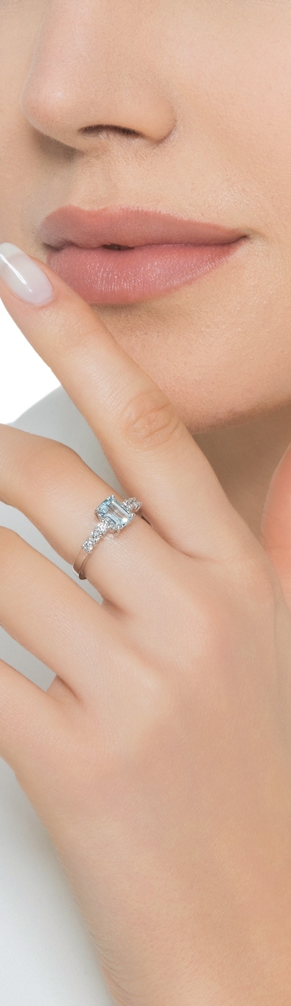 Bague avec brillants et aquamarine rectangulaire de 7x5 mm en or blanc 18k avec diamants taille brillant, couleur H et pureté VS.
