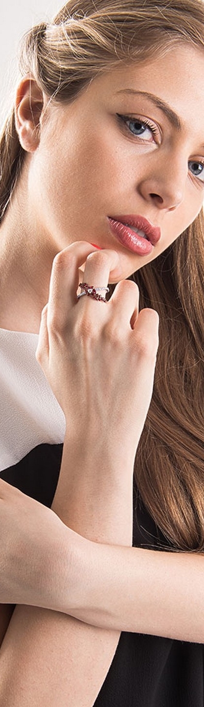 Bague en or blanc 18 carats avec design croisé, sertie de diamants taille brillante couleur H et pureté VS au centre et sur un côté de l’anneau, accompagnée de rubis taille brillante. Un bijou raffiné et lumineux qui allie le contraste des pierres précieuses à un design moderne et élégant, idéal pour le quotidien comme pour des occasions spéciales.