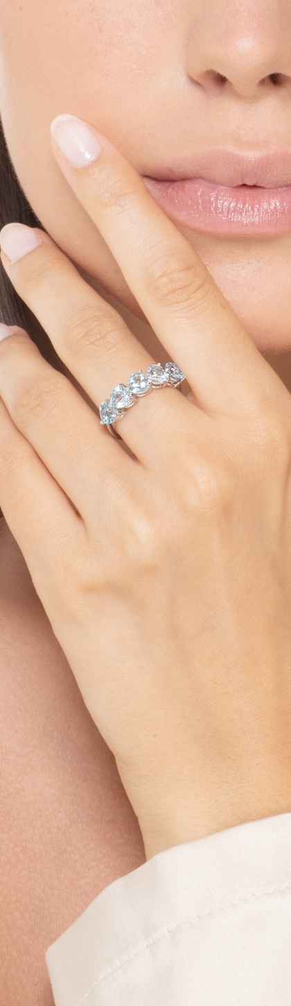 Bague en or blanc 18k avec 5 aigues-marines en forme de cœur