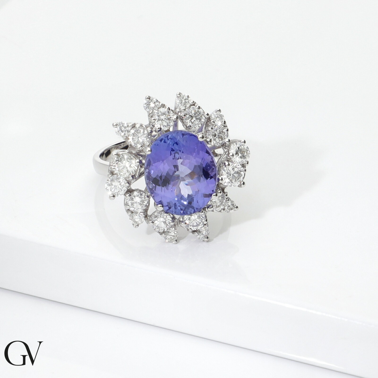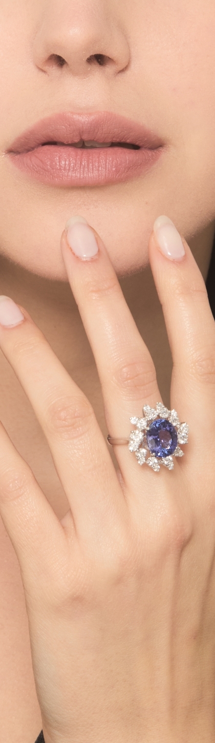 Bague en or blanc 18k avec une tanzanite ovale et des diamants