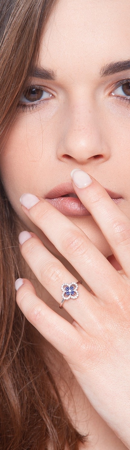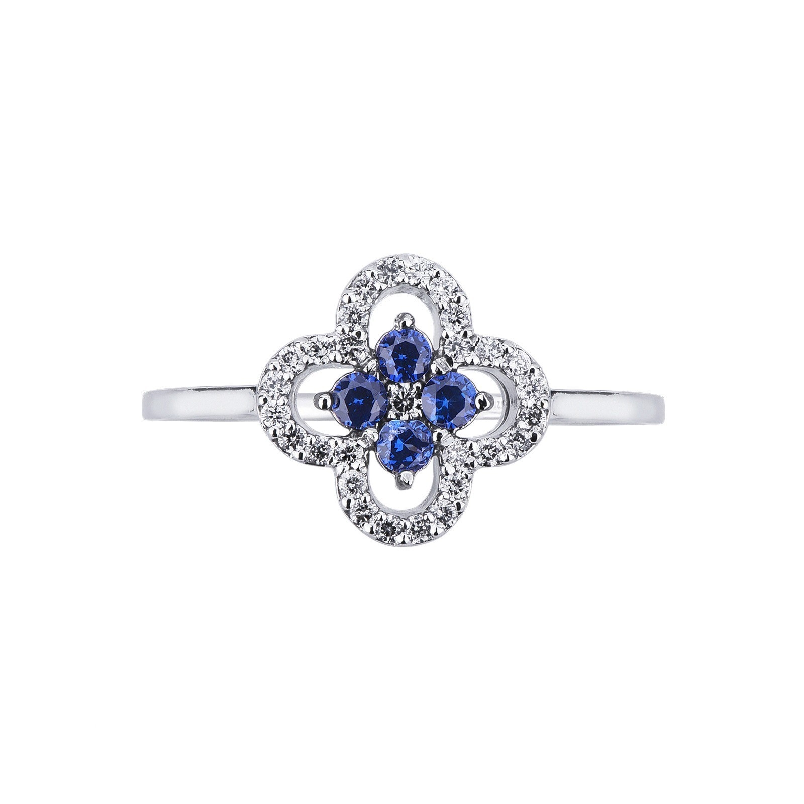 Bague en or blanc 18k en forme de fleur avec saphirs bleu